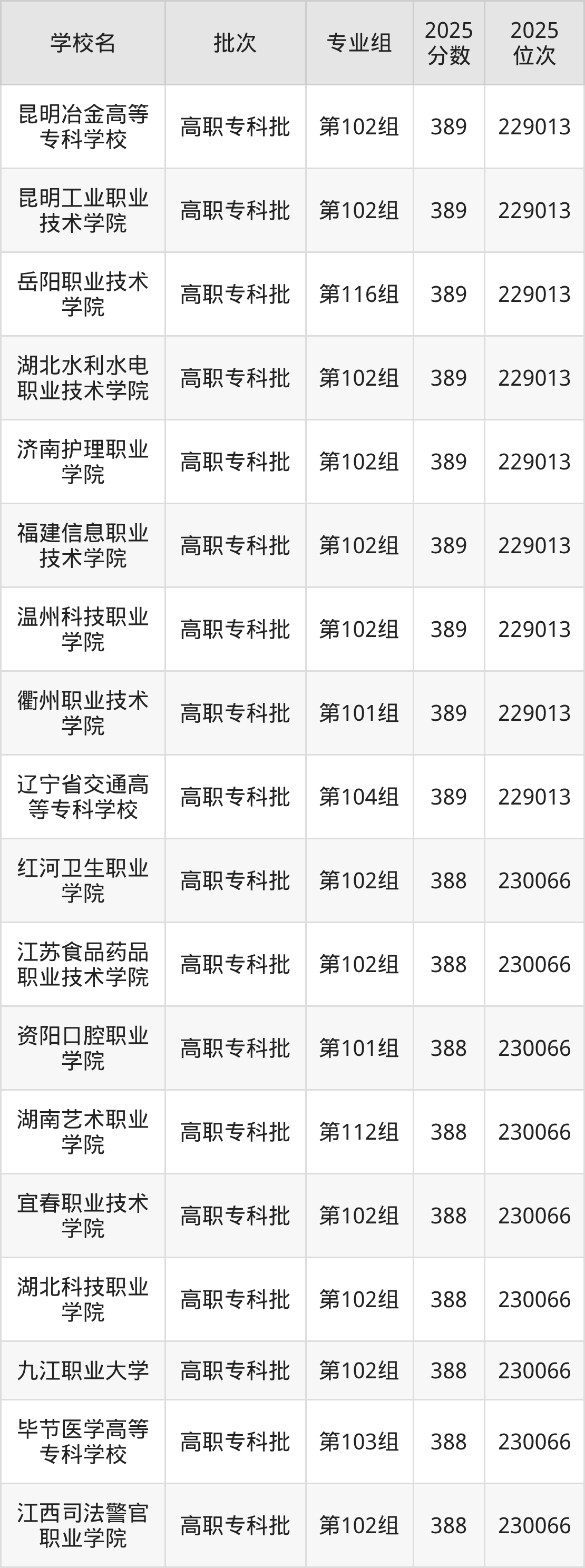 2025年湖南高考物理类388分(229014名~230066名)能上的大学有江苏食品药品职业技术学院第102组、江西司法警官职业学院第102组、九江职业大学第102组、宜春职业技术学院第102组等。