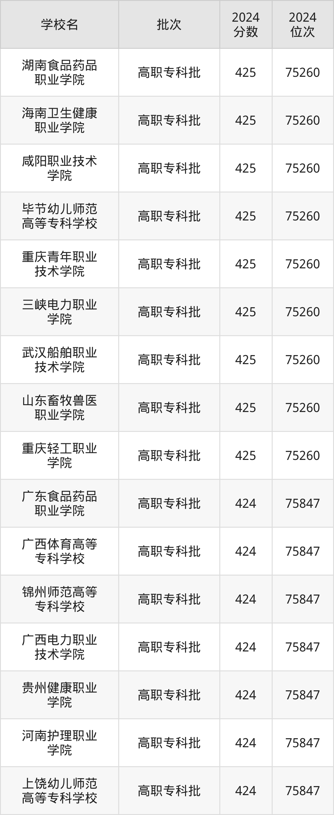 2024年云南高考文科424分(75261名~75847名)能上的大学有广西体育高等专科学校、广东食品药品职业学院、贵州健康职业学院、锦州师范高等专科学校等。