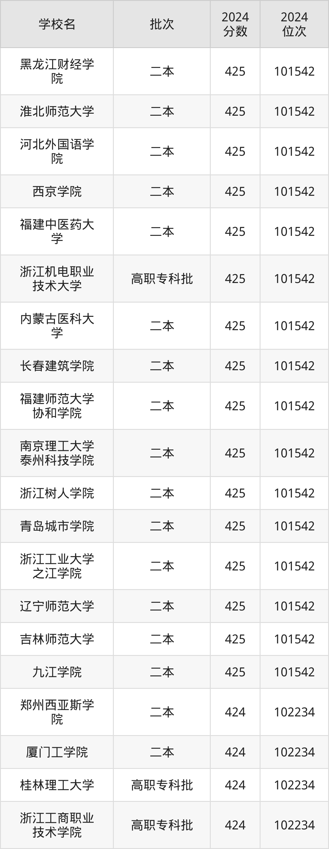 这些都是2025年高考理科101543名~102234名考生可以报考的大学,更多学校名单如下表所示: