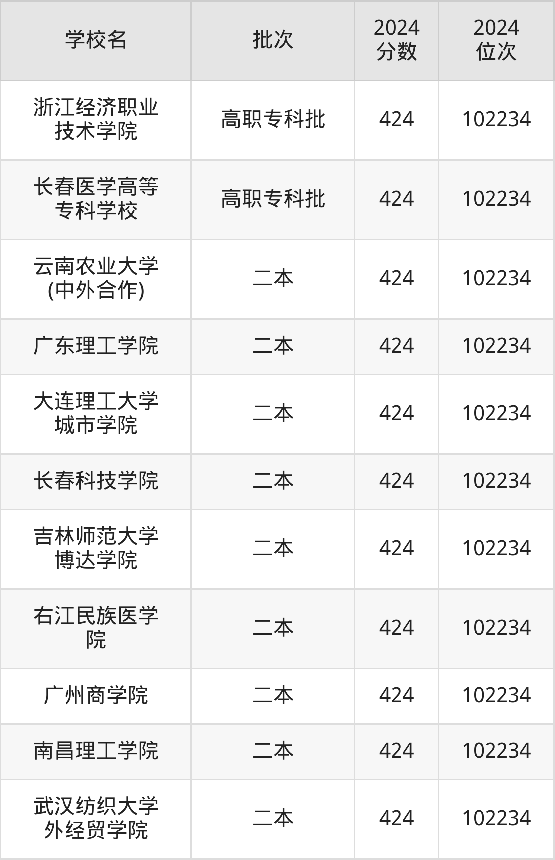 2024年云南高考理科424分(101543名~102234名)能上的大学有长春科技学院、武汉纺织大学外经贸学院、南昌理工学院、郑州西亚斯学院等。