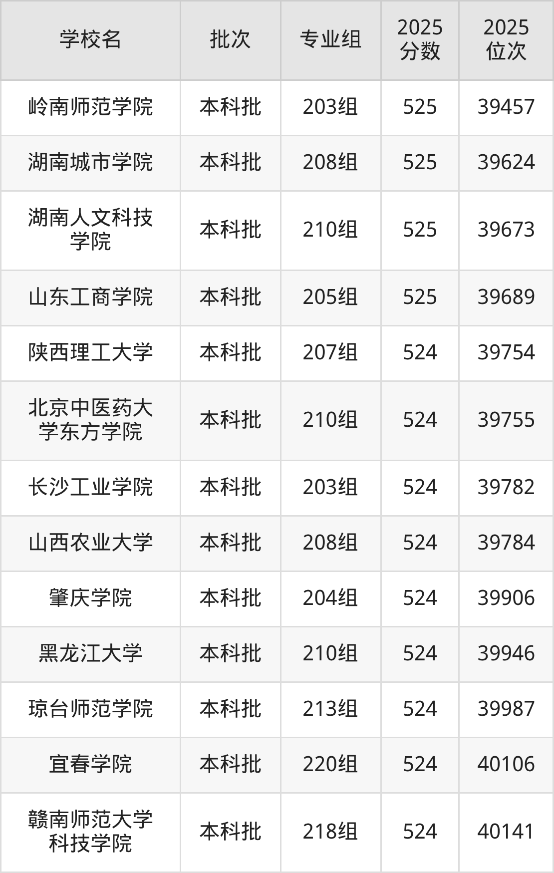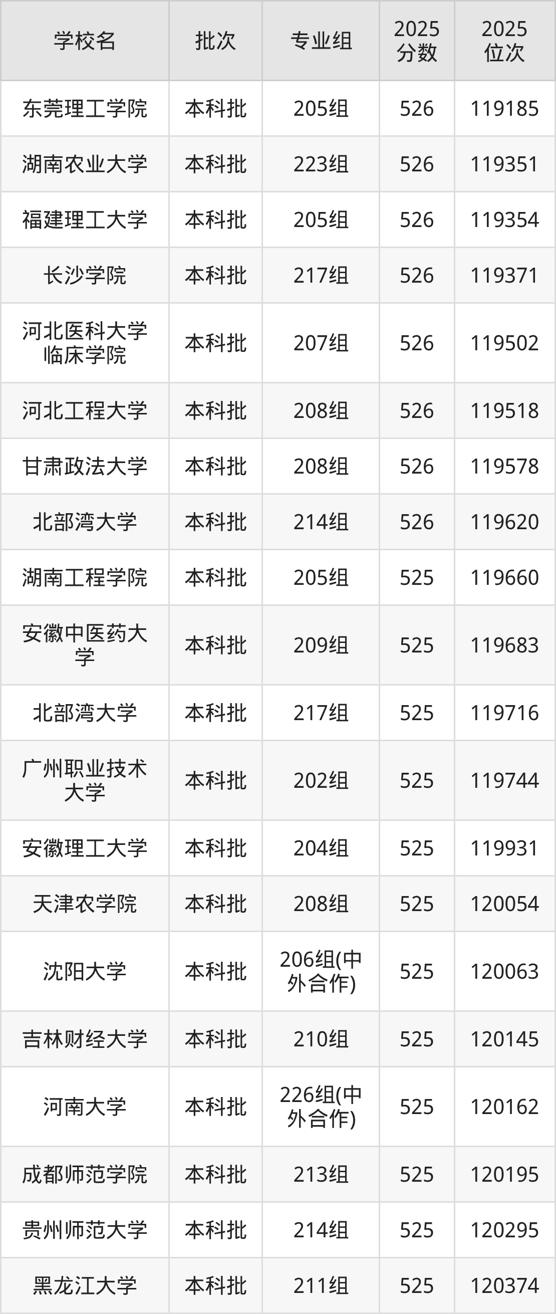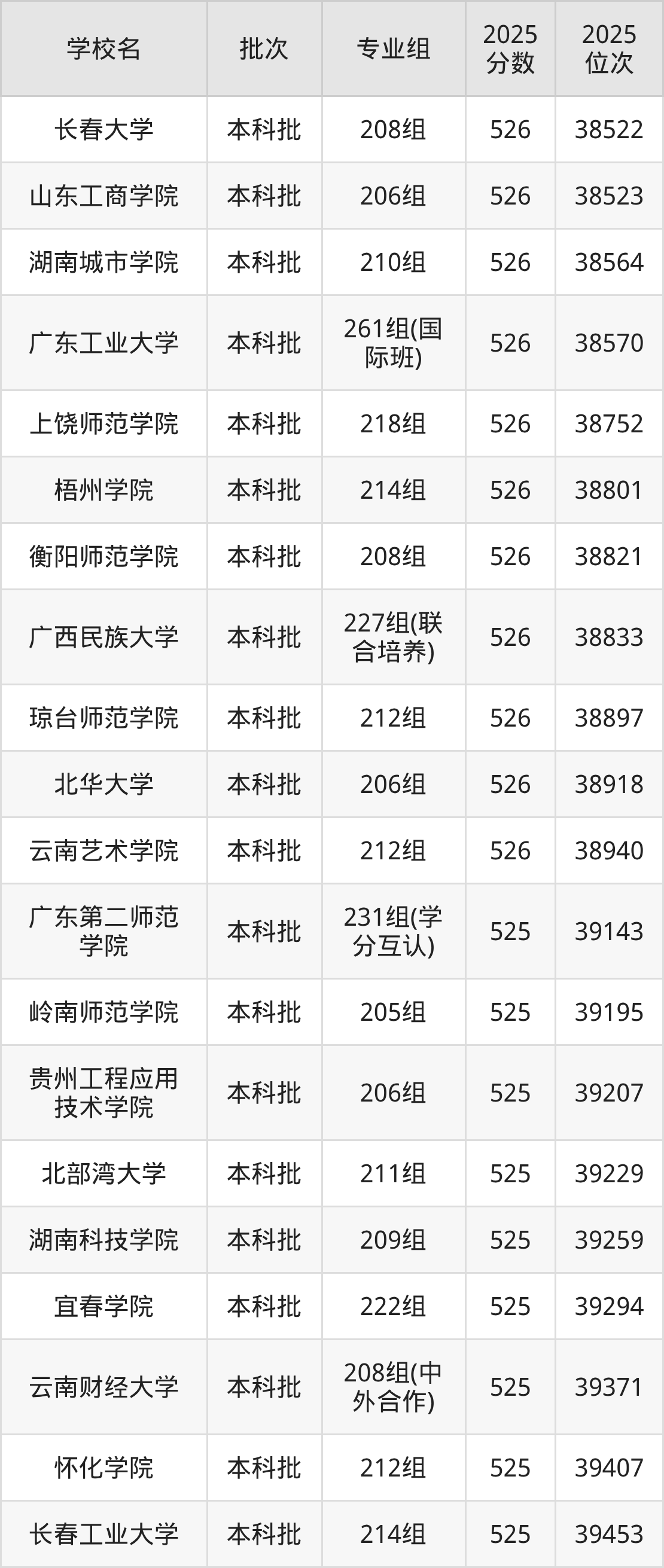 2025年广东高考历史类525分(38986名~39694名)能上的大学有长春工业大学214组、宜春学院222组、怀化学院212组、湖南科技学院209组等。