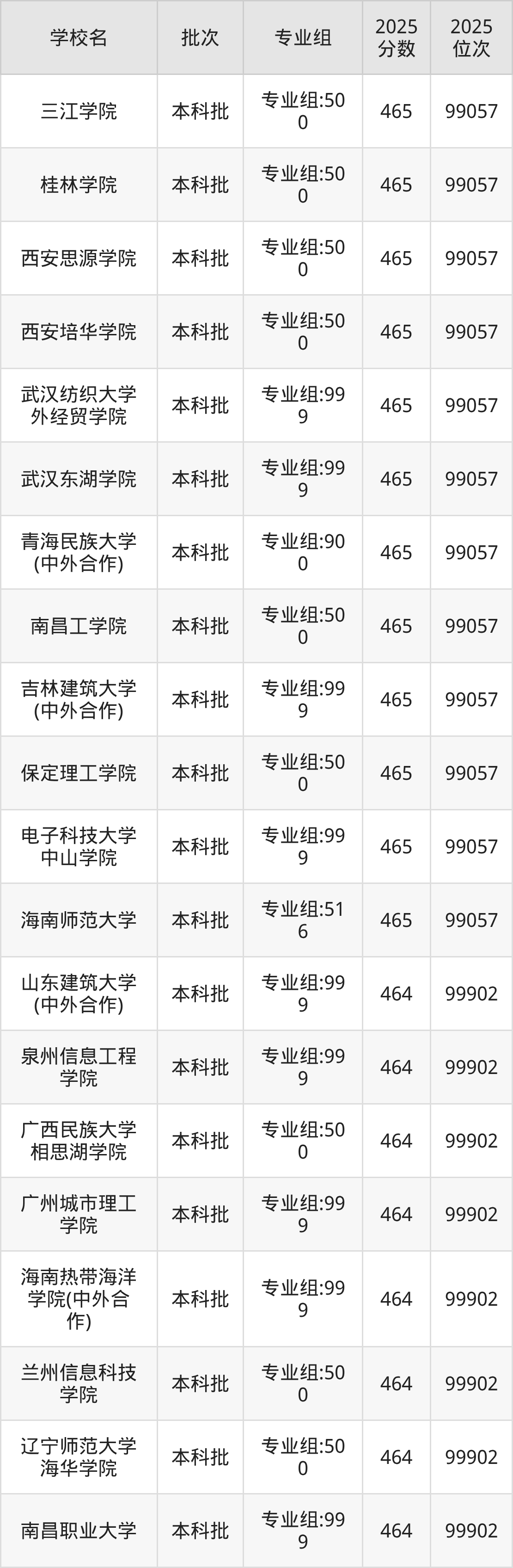 2025年福建高考历史类464分(22151名~22376名)能上的大学有泉州信息工程学院专业组:999、广西民族大学专业组:999、昆明医科大学海源学院专业组:999、浙江万里学院(中外合作)专业组:999。