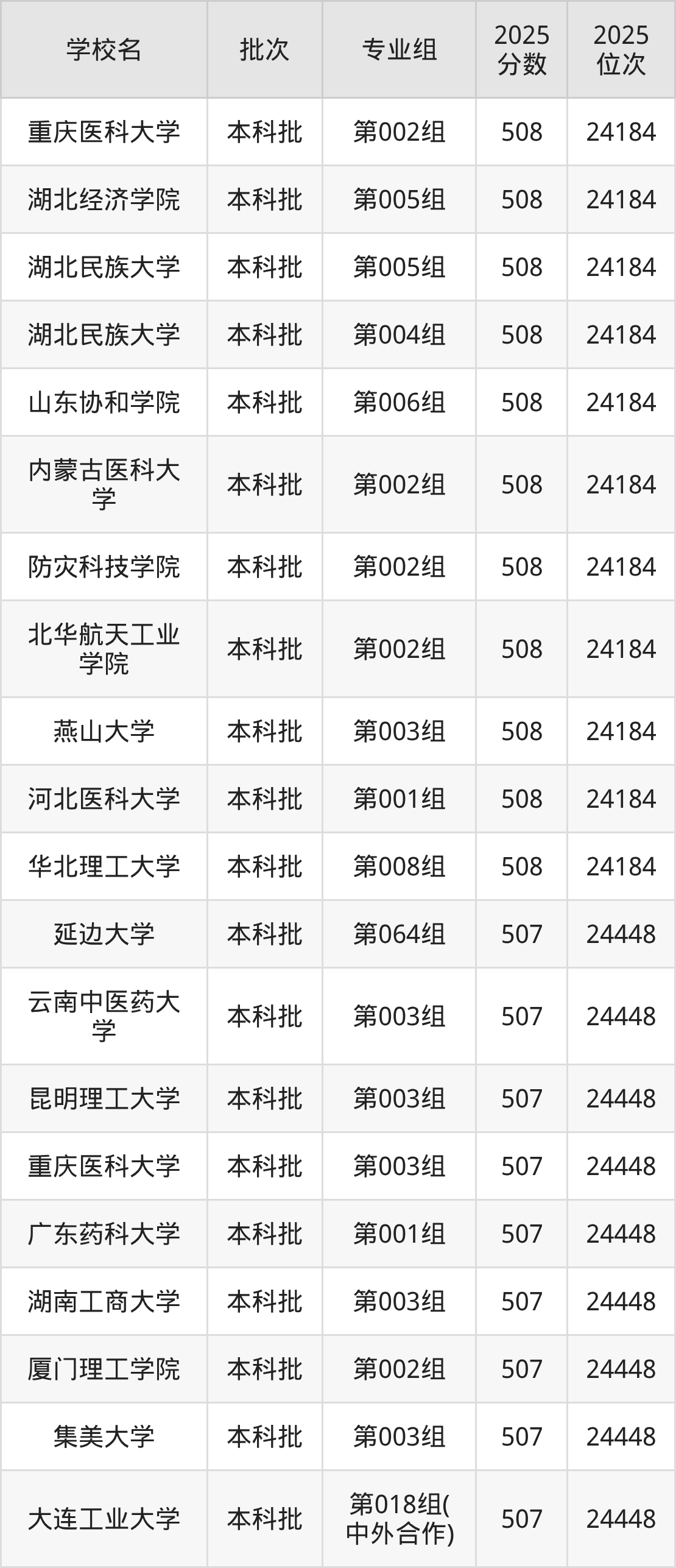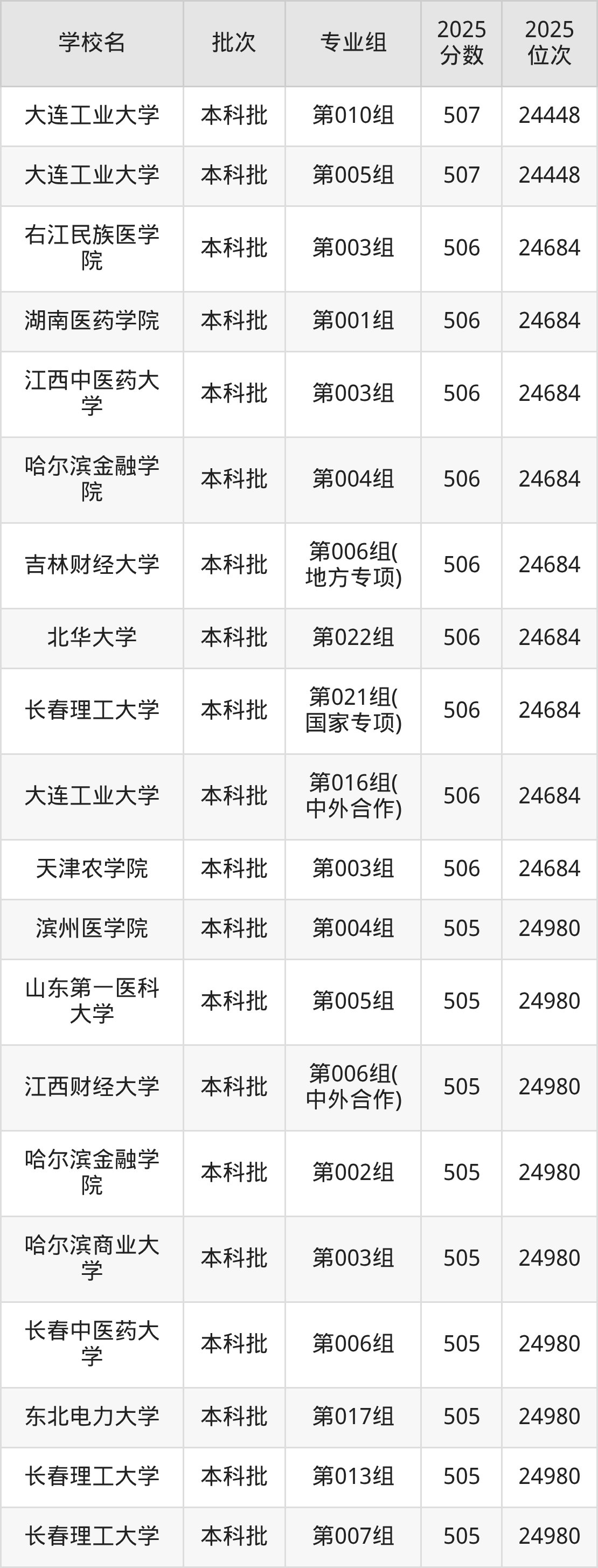 2025年吉林高考物理类506分(24449名~24684名)能上的大学有天津农学院第003组、大连工业大学第016组(中外合作)、长春理工大学第021组(国家专项)、北华大学第022组等。