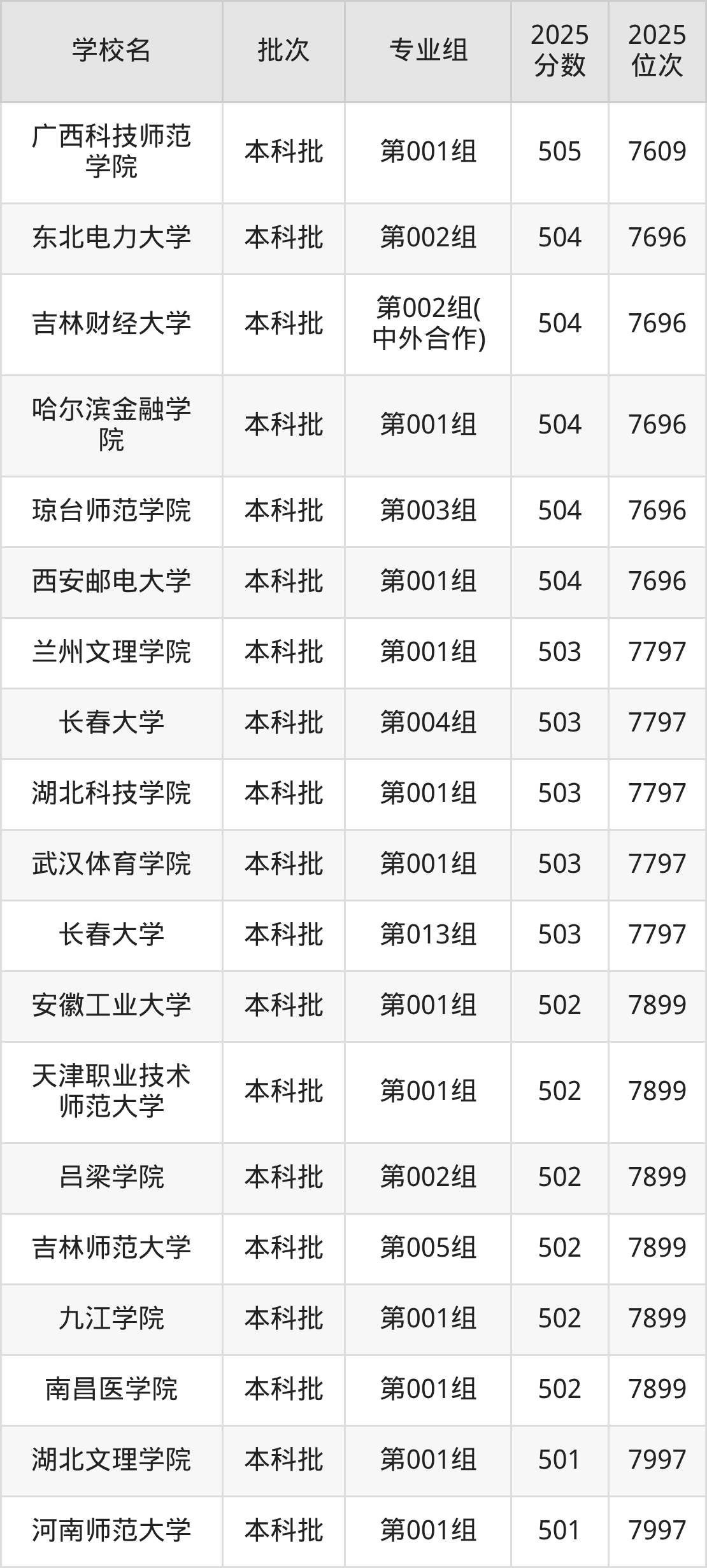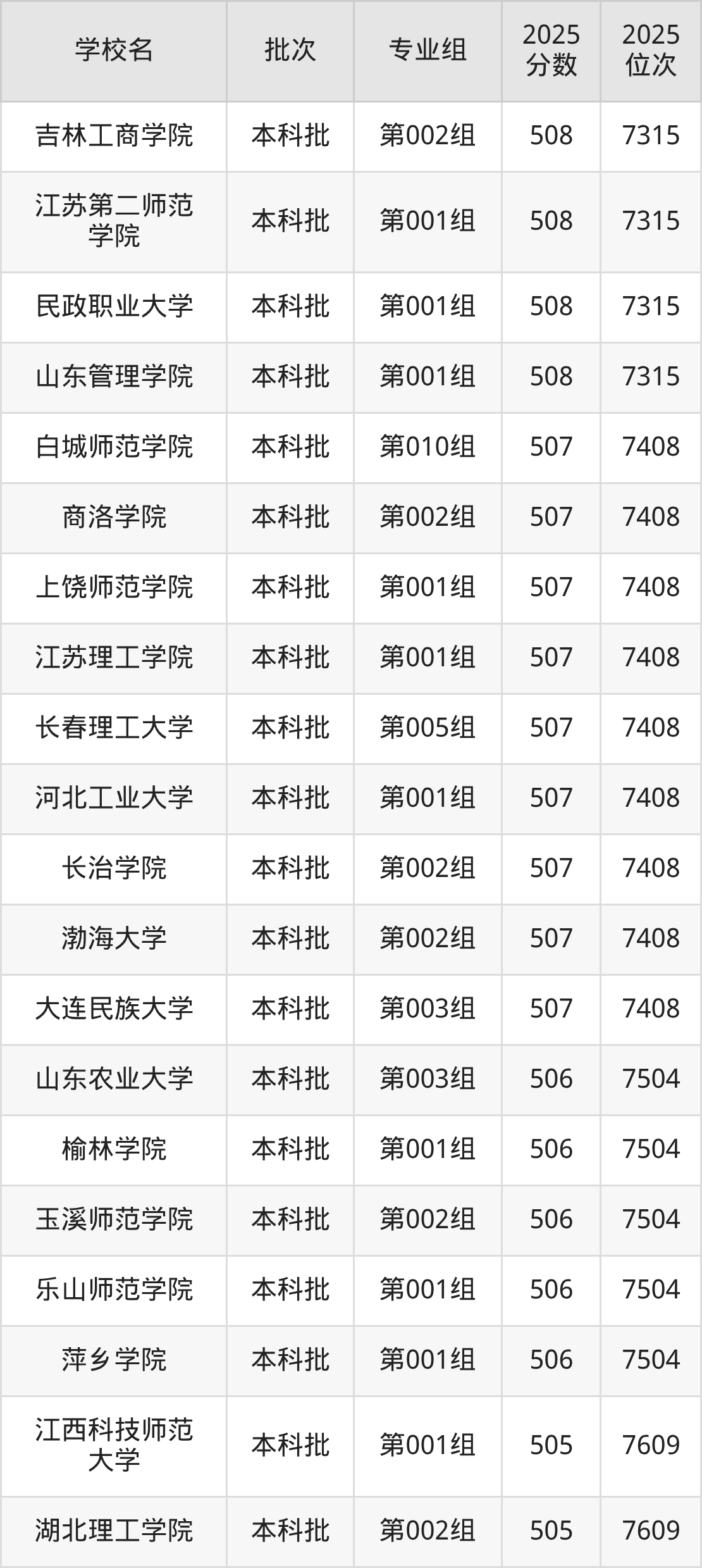 2025年吉林高考历史类506分(7409名~7504名)能上的大学有萍乡学院第001组、山东农业大学第003组、乐山师范学院第001组、玉溪师范学院第002组等。