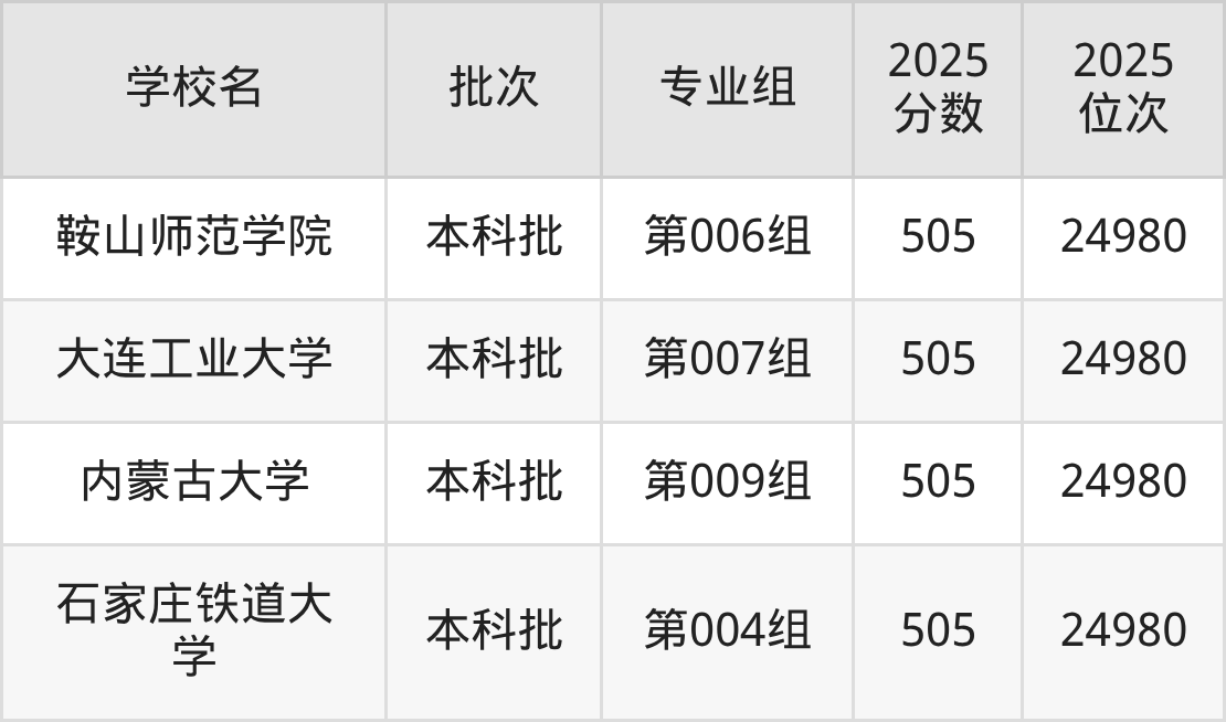 另外录取位次低于该区间(较稳妥)的有内蒙古大学第009组(24980名)、长春理工大学第013组(24980名)等;录取位次高于该区间(可冲)的有大连工业大学第005组(24448名)、大连工业大学第010组(24448名)等。