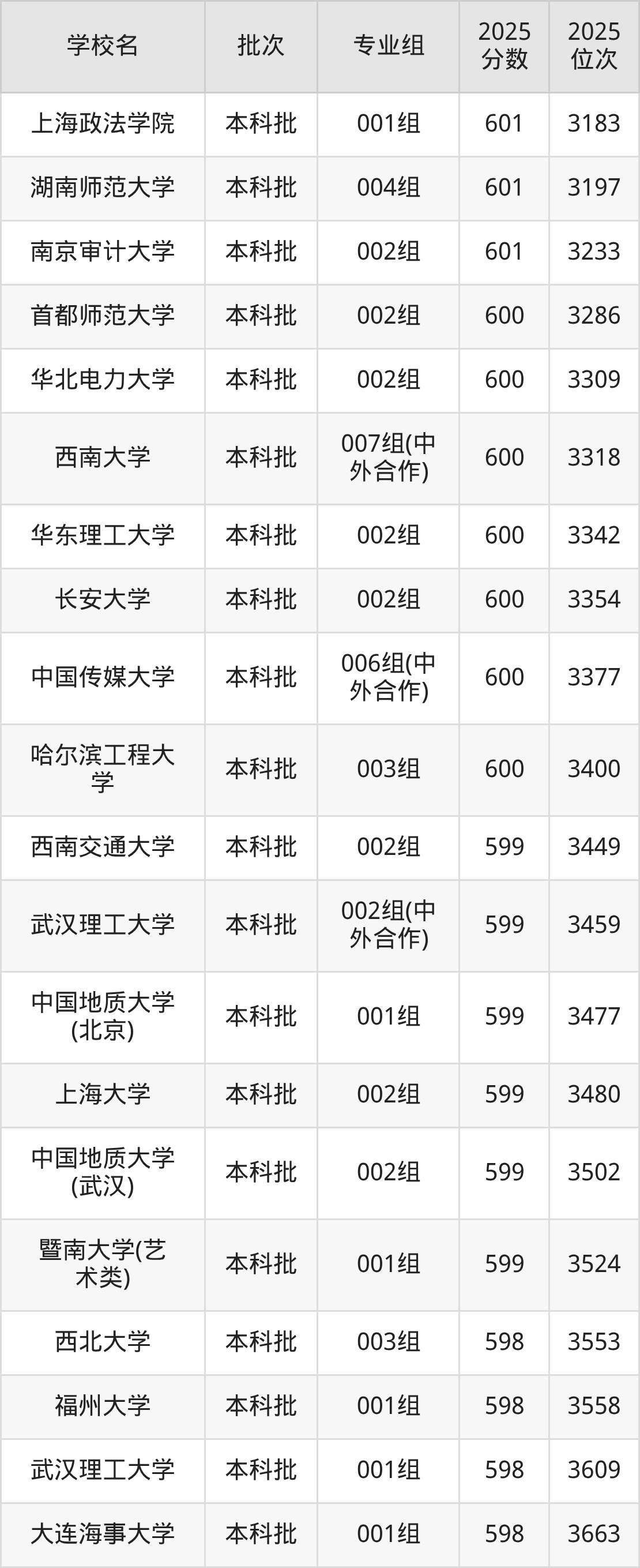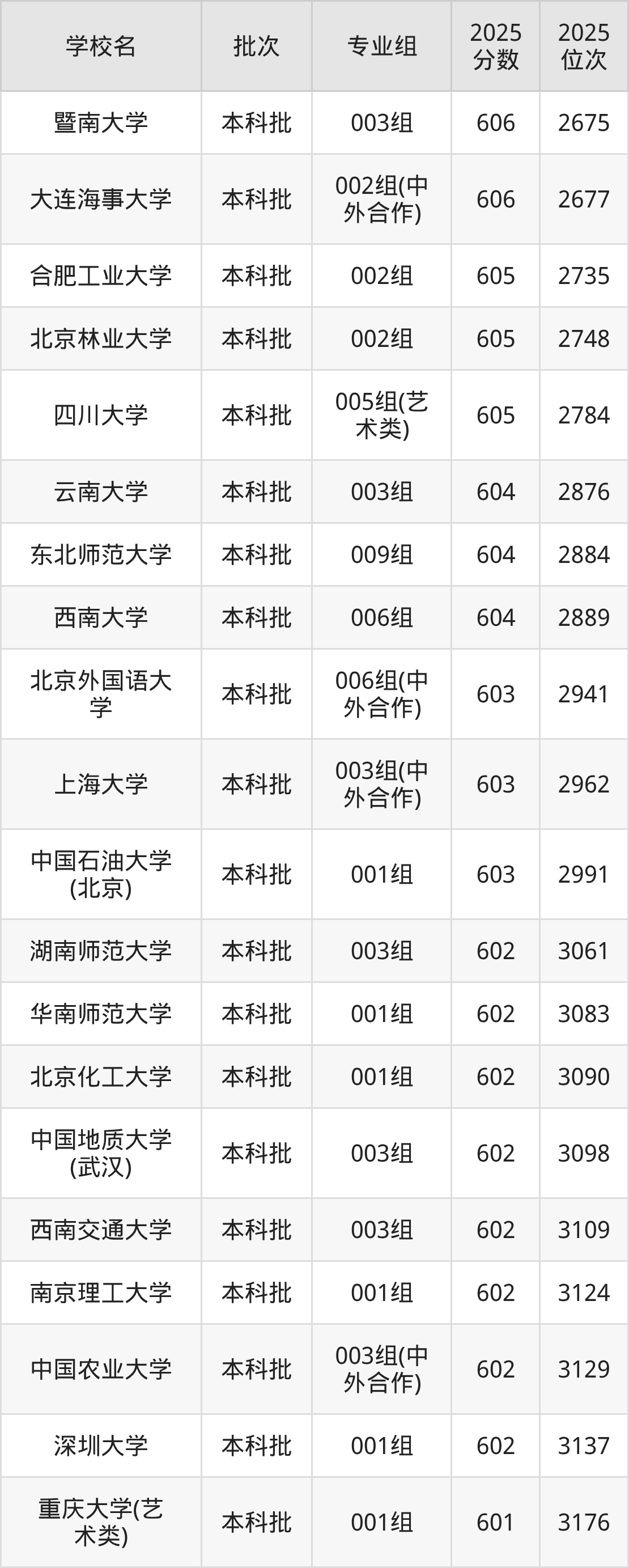 2025年安徽高考历史类601分(3158名~3285名)能上的大学有重庆大学(艺术类)001组、湖南师范大学004组、南京审计大学002组、上海政法学院001组。