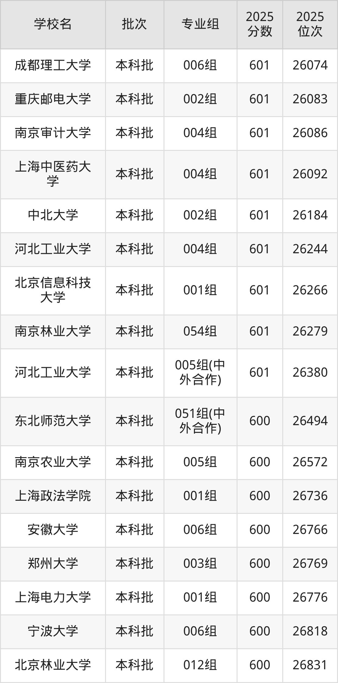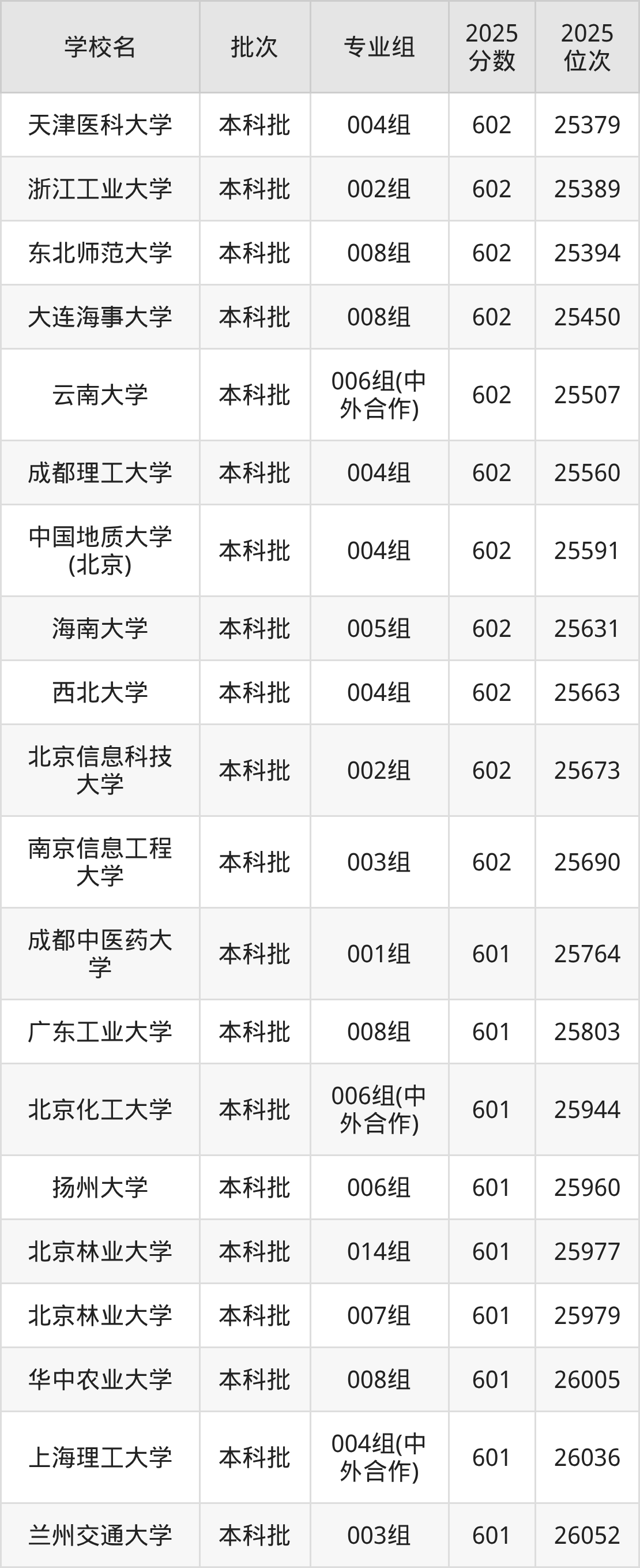 2025年安徽高考物理类601分(25743名~26393名)能上的大学有北京化工大学006组(中外合作)、北京林业大学007组、北京林业大学014组、北京信息科技大学001组等。