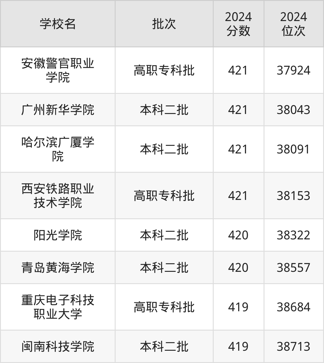 陕西高考420分:文科排名38635位、理科排名100484位。该分数位次对应能上的大学文科有青岛黄海学院、阳光学院;理科有南昌理工学院、武汉工程大学邮电与信息工程学院,更多名单如下文所示,2025届考生可参考。