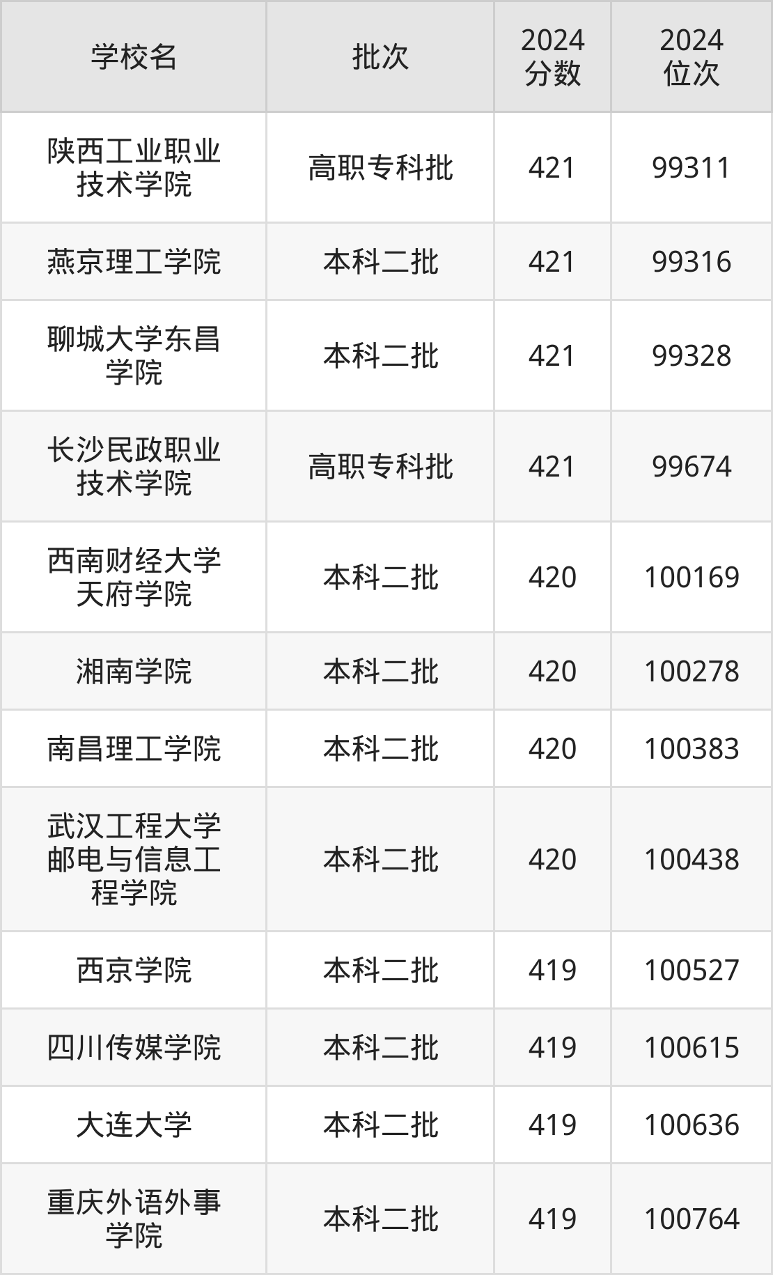 2024年陕西高考理科420分(99746名~100484名)能上的大学有南昌理工学院、武汉工程大学邮电与信息工程学院、湘南学院、西南财经大学天府学院。