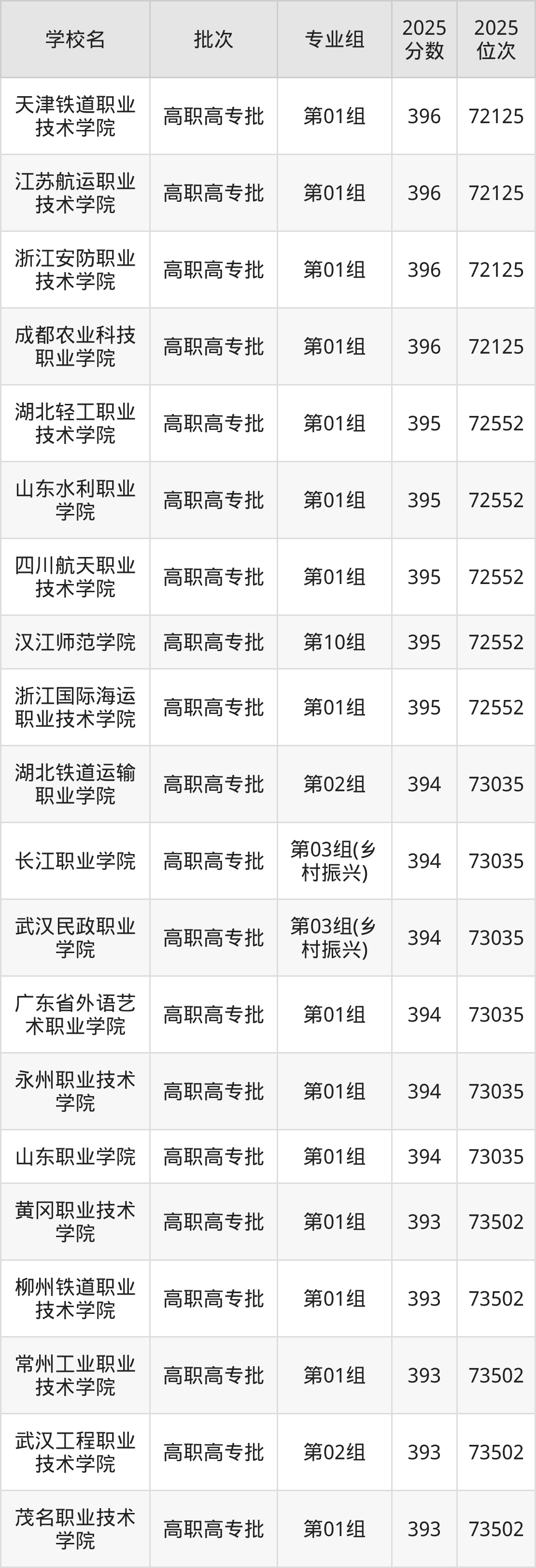 2025年湖北高考历史类394分(72553名~73035名)能上的大学有长江职业学院第03组(乡村振兴)、武汉民政职业学院第03组(乡村振兴)、湖北铁道运输职业学院第02组、山东职业学院第01组等。
