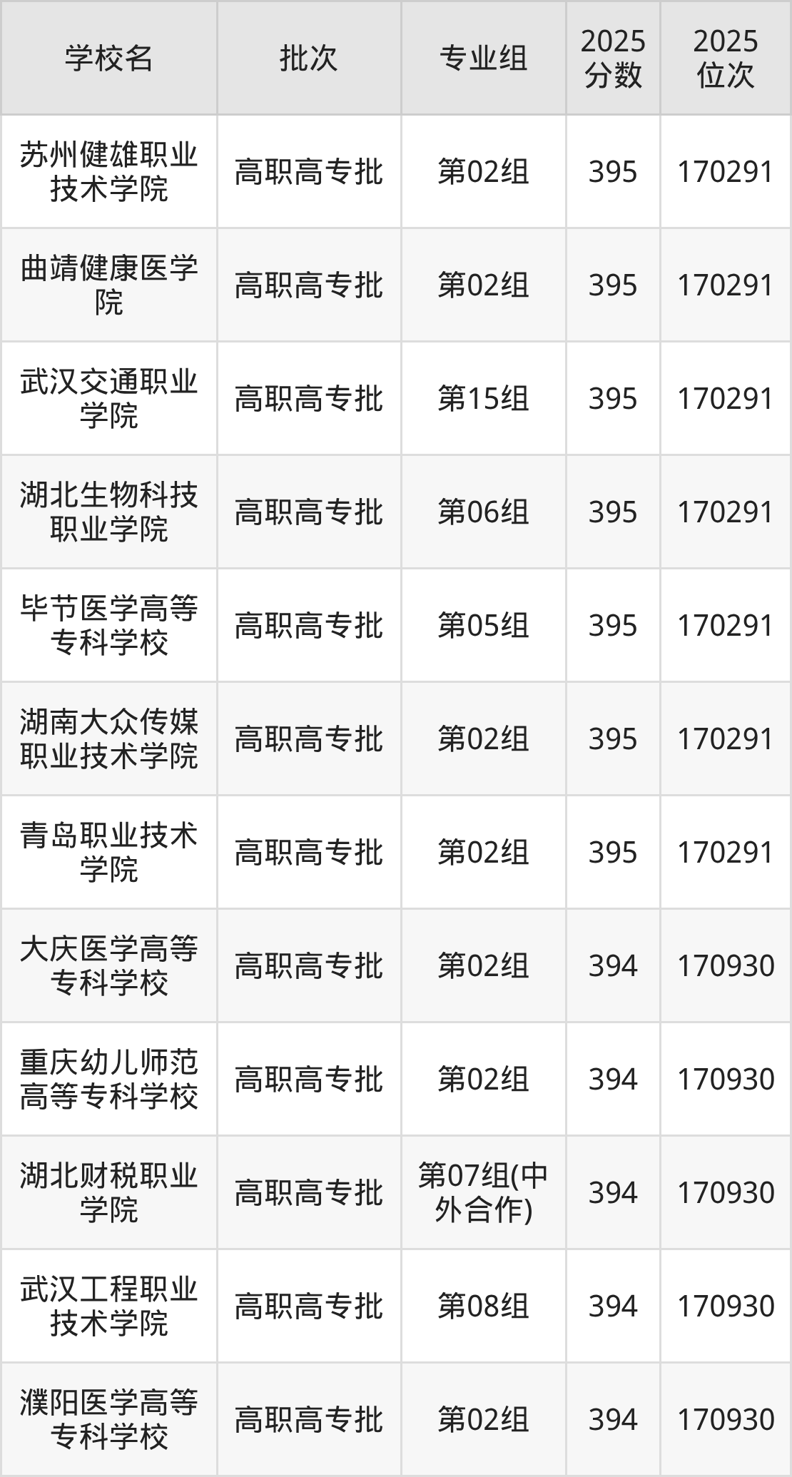 2025年湖北高考物理类394分(170292名~170930名)能上的大学有武汉工程职业技术学院第08组、湖北财税职业学院第07组(中外合作)、大庆医学高等专科学校第02组、濮阳医学高等专科学校第02组等。