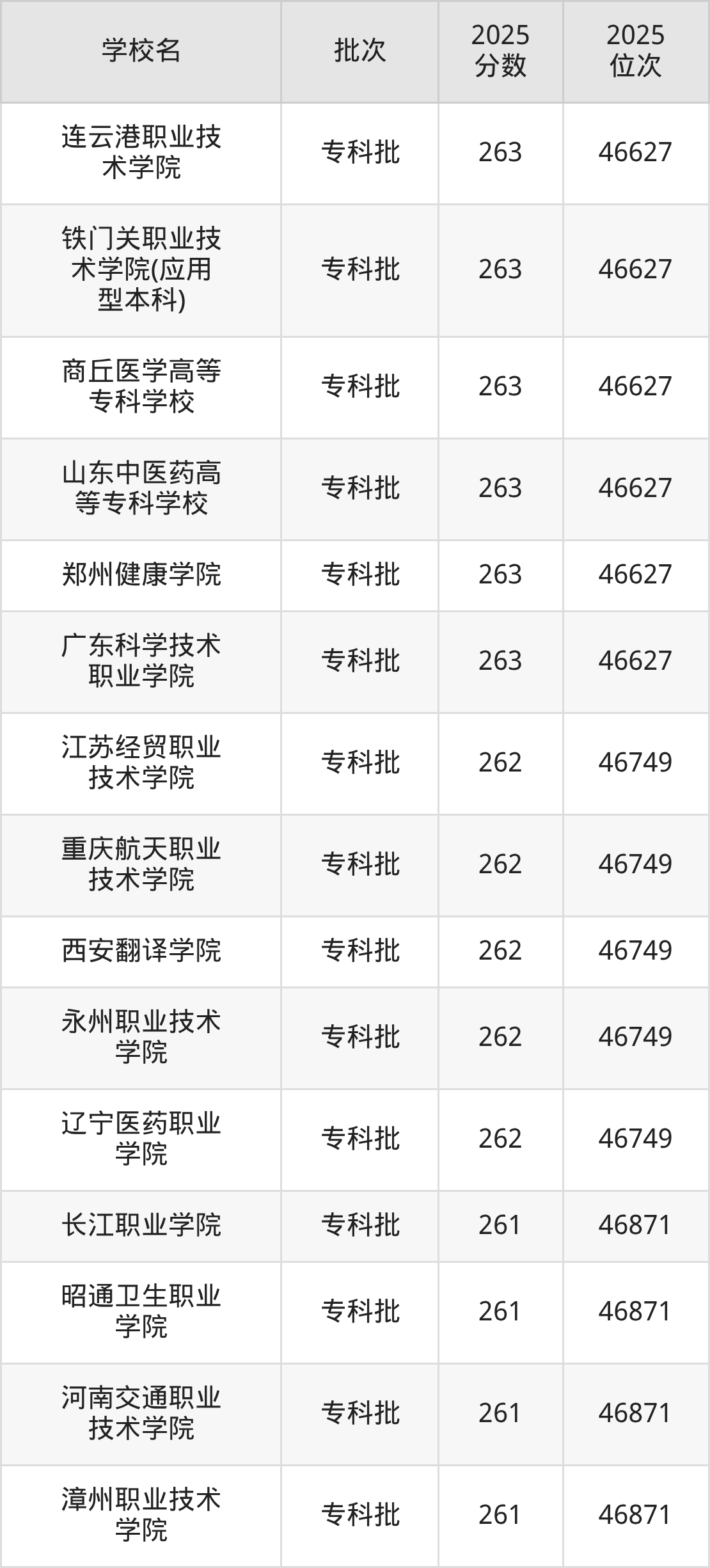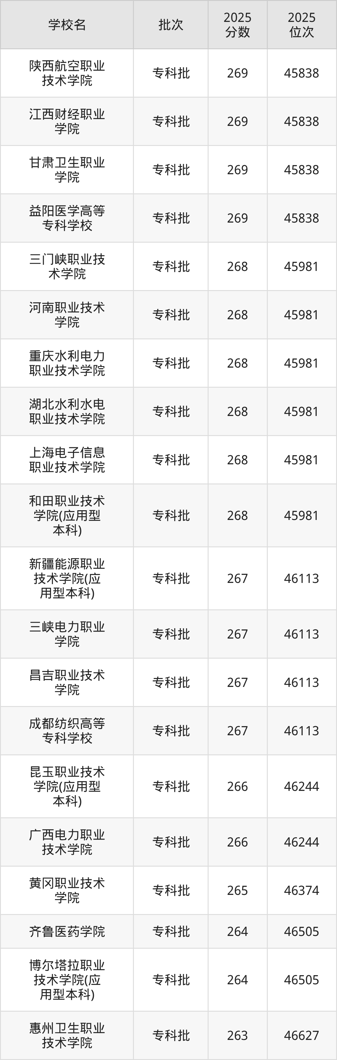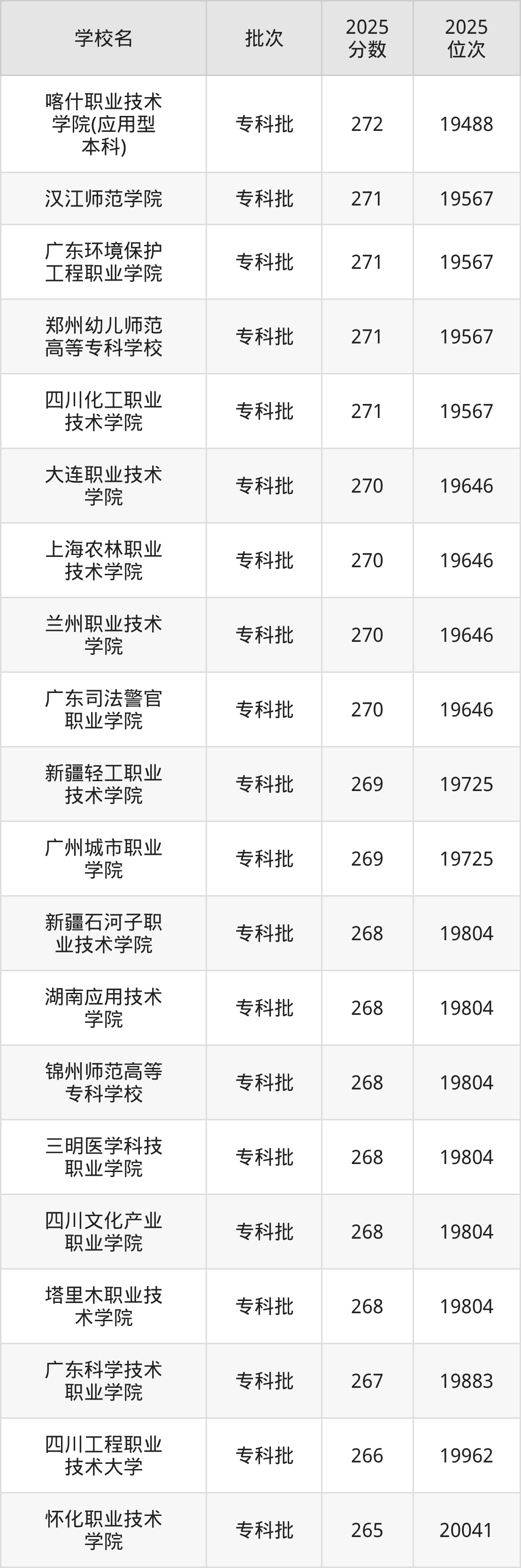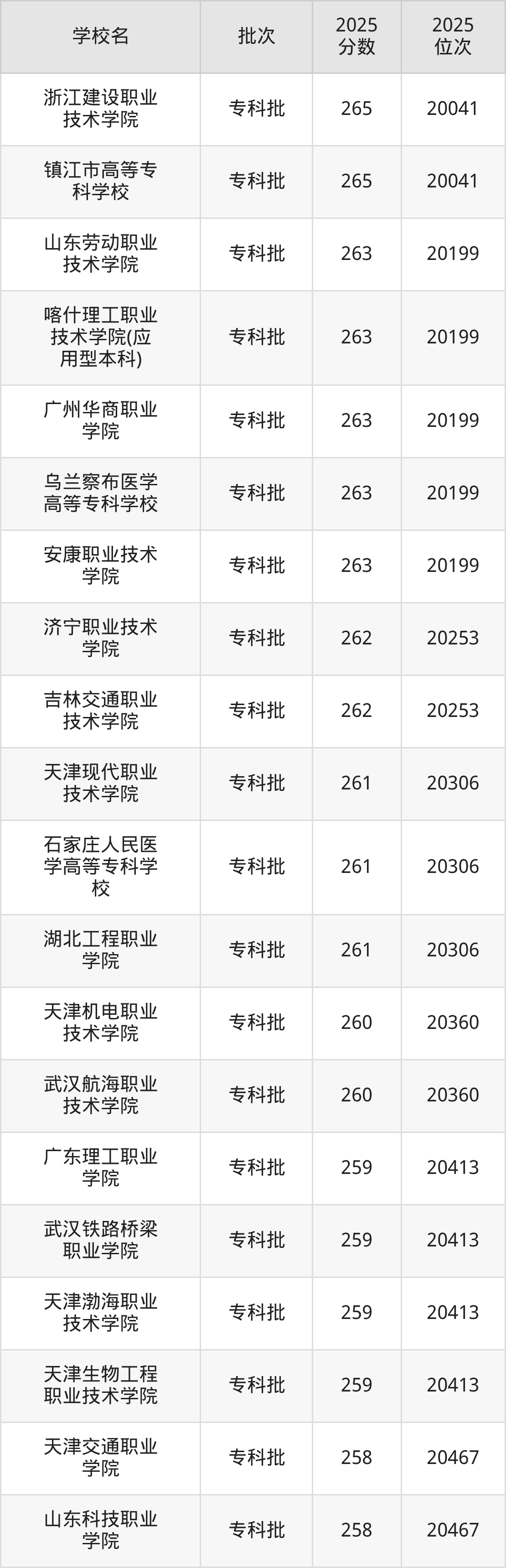 2025年新疆高考文科265分(19963名~20041名)能上的大学有镇江市高等专科学校、浙江建设职业技术学院、怀化职业技术学院。