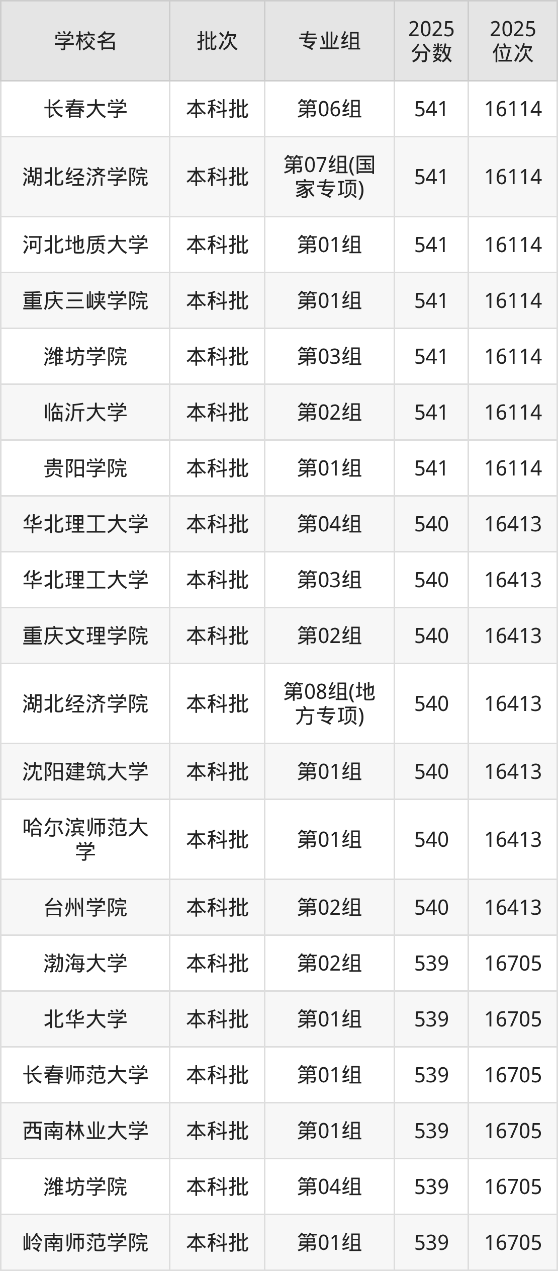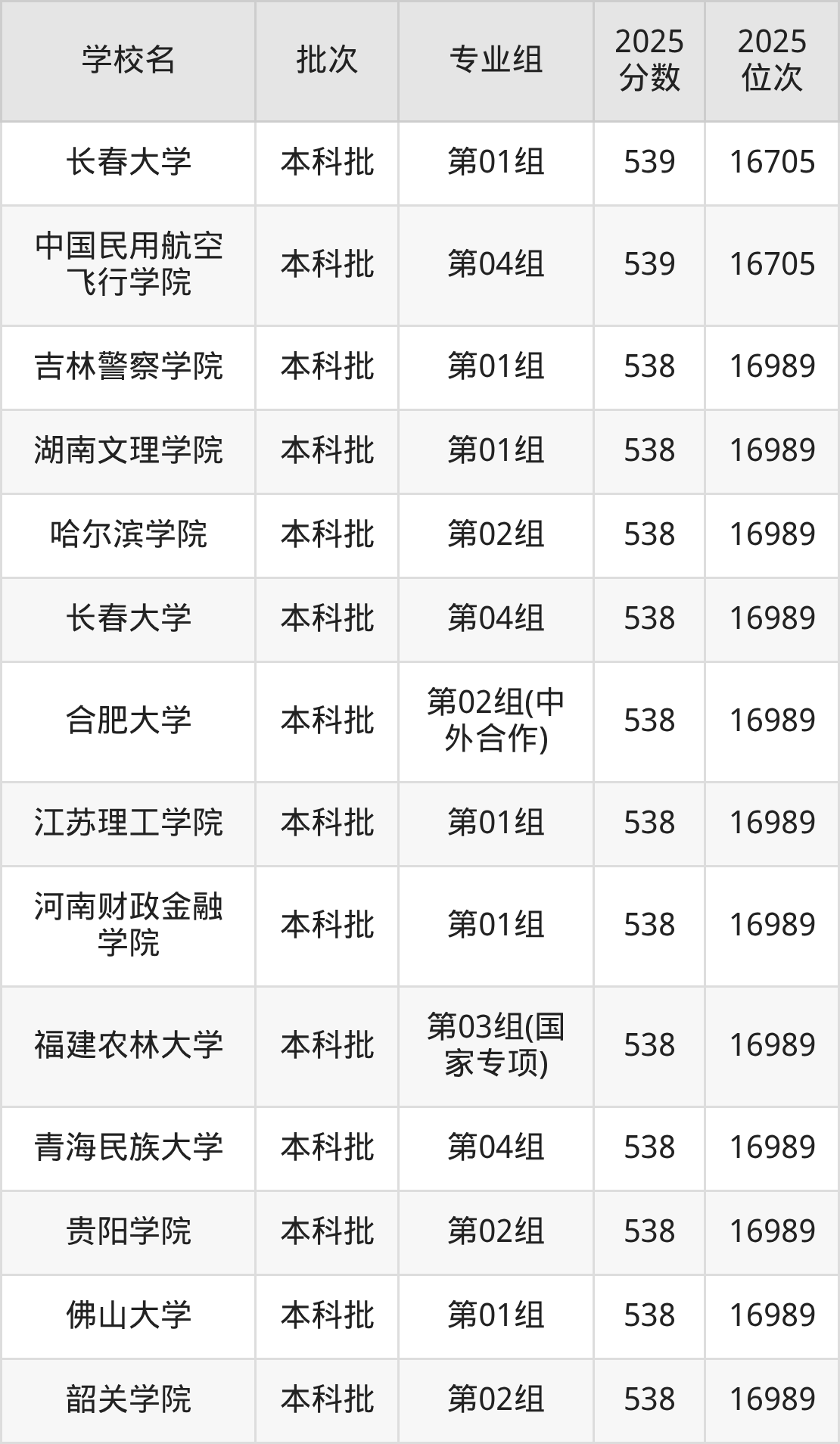 2025年湖北高考历史类539分(16414名~16705名)能上的大学有中国民用航空飞行学院第04组、渤海大学第02组、北华大学第01组、长春师范大学第01组等。