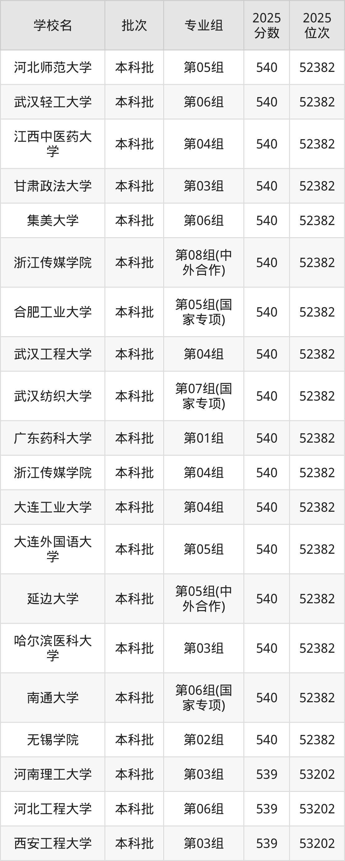 2025年湖北高考物理类539分(52383名~53202名)能上的大学有河北工程大学第06组、大连大学第06组、哈尔滨理工大学第01组、浙江科技大学第01组等。