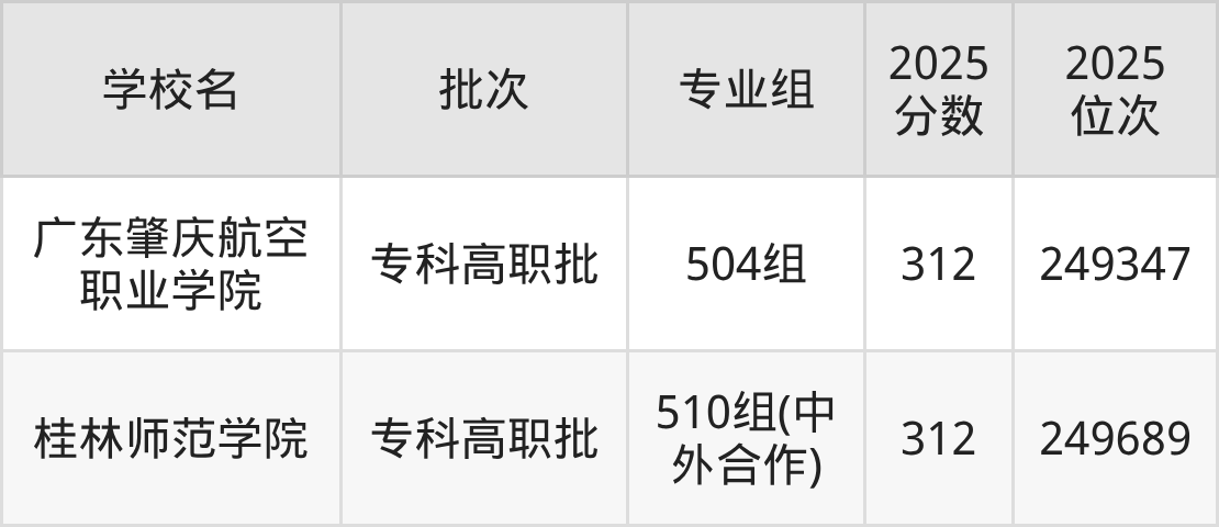 2025年广东高考历史类312分(248946名~249676名)能上的大学有桂林师范学院510组(中外合作)、广东肇庆航空职业学院504组。