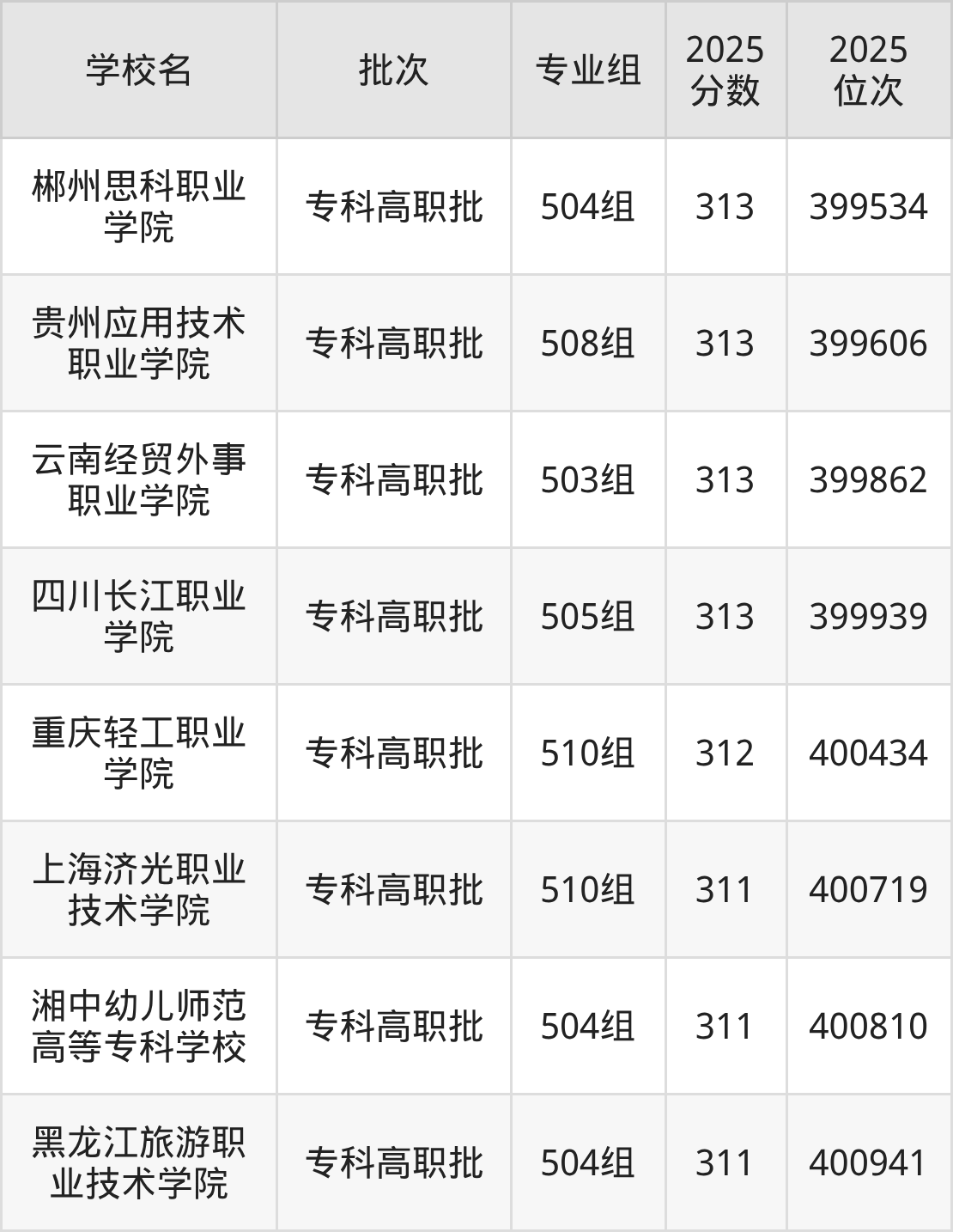 另外录取位次低于该区间(较稳妥)的有上海济光职业技术学院510组(400719名)、湘中幼儿师范高等专科学校504组(400810名)等;录取位次高于该区间(可冲)的有四川长江职业学院505组(399939名)、云南经贸外事职业学院503组(399862名)等。
