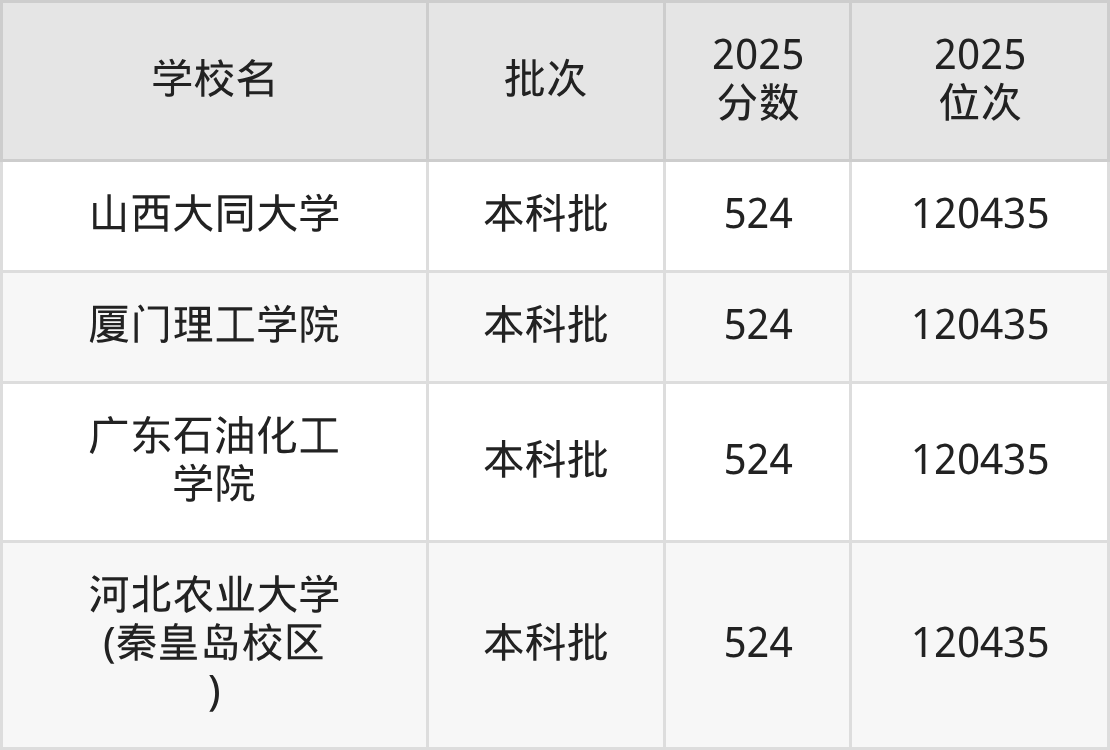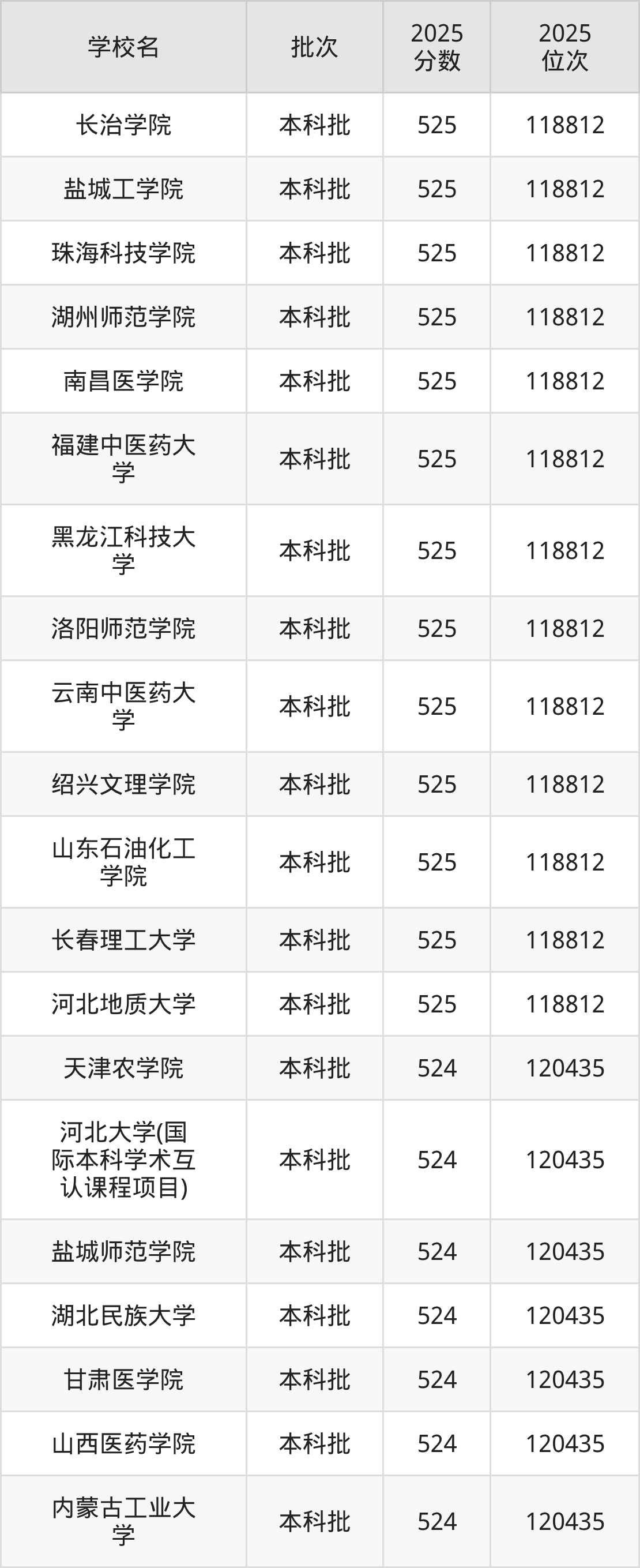 2025年河北高考物理类524分(118813名~120435名)能上的大学有内蒙古工业大学、天津农学院、甘肃医学院、山西医药学院等。