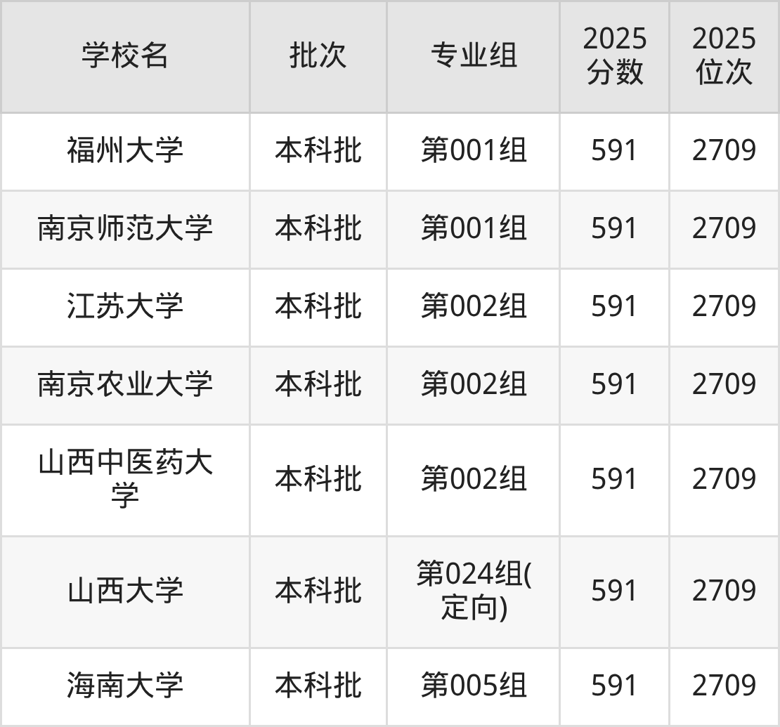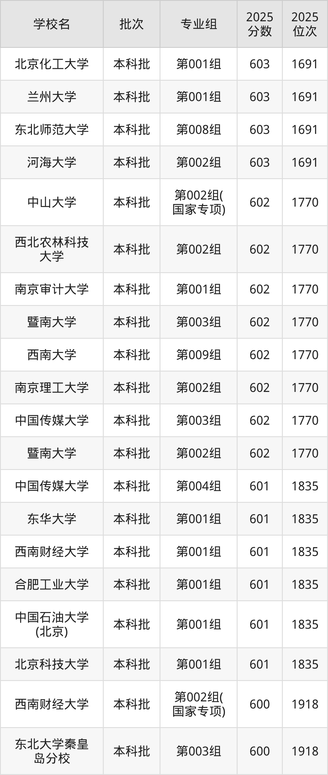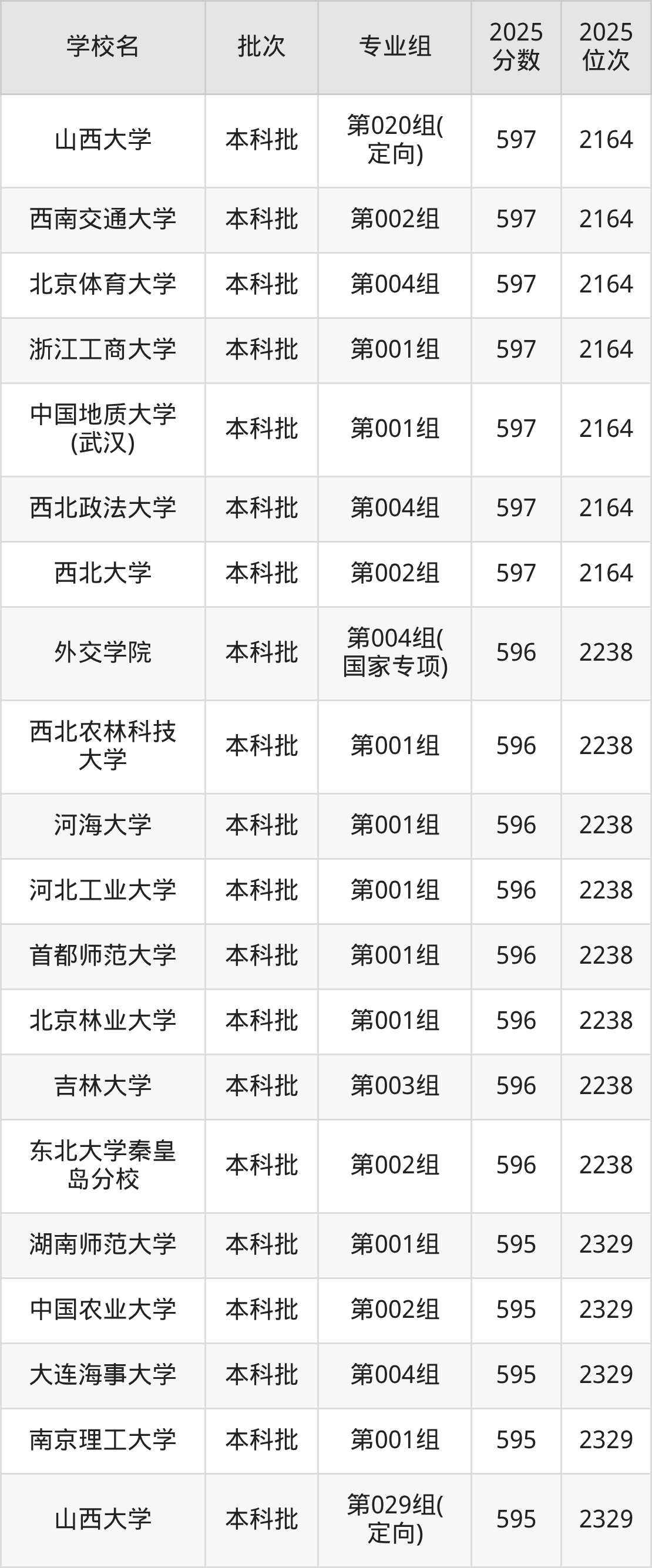 2025年山西高考历史类596分(2165名~2238名)能上的大学有北京林业大学第001组、首都师范大学第001组、外交学院第004组(国家专项)、河北工业大学第001组等。
