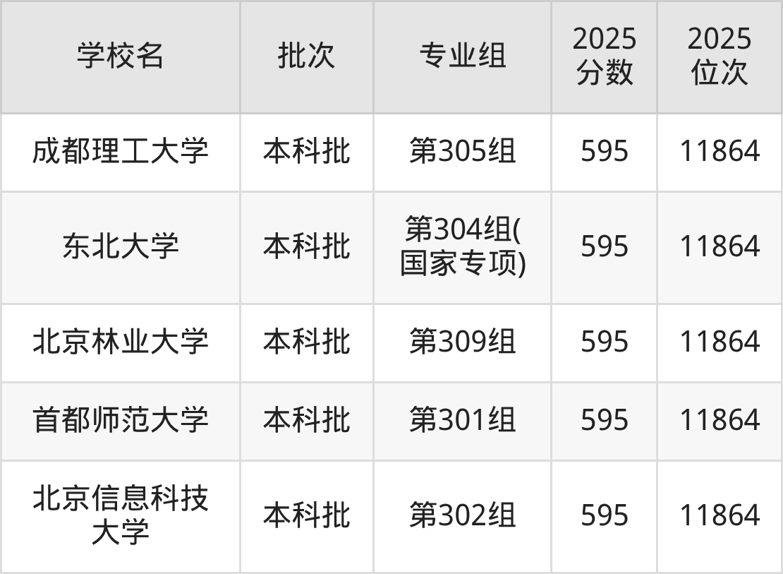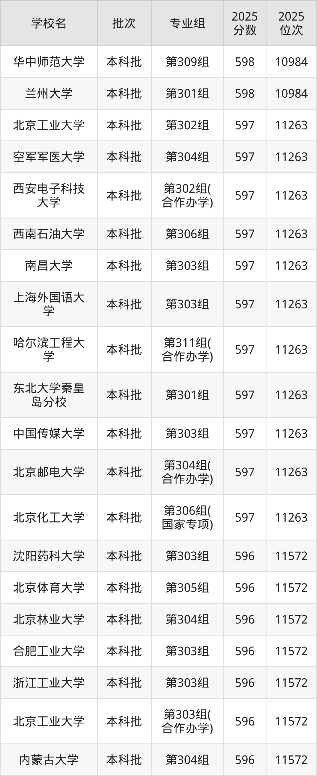 2025年山西高考物理类596分(11264名~11572名)能上的大学有北京工业大学第303组(合作办学)、北京林业大学第304组、北京体育大学第305组、内蒙古大学第304组等。