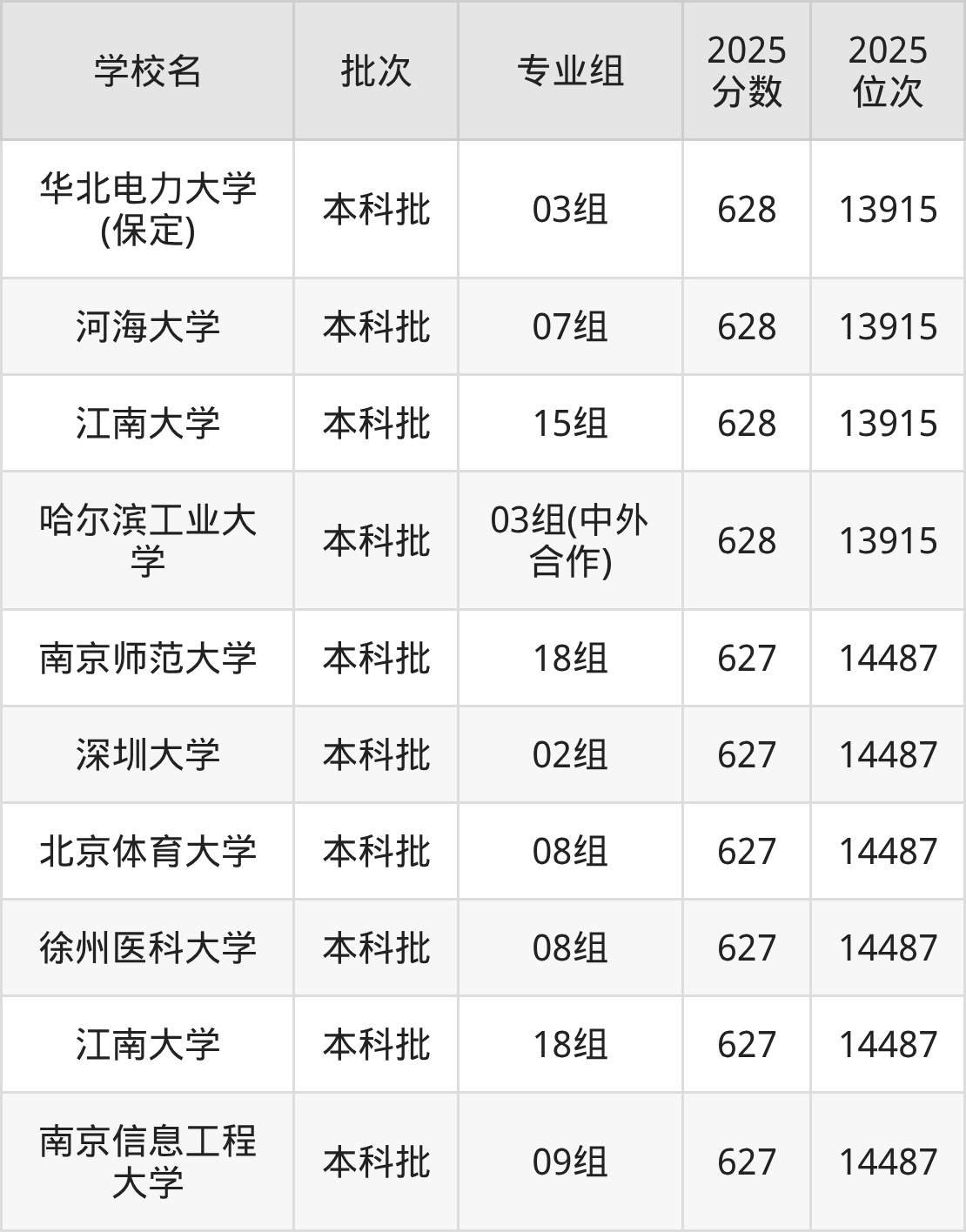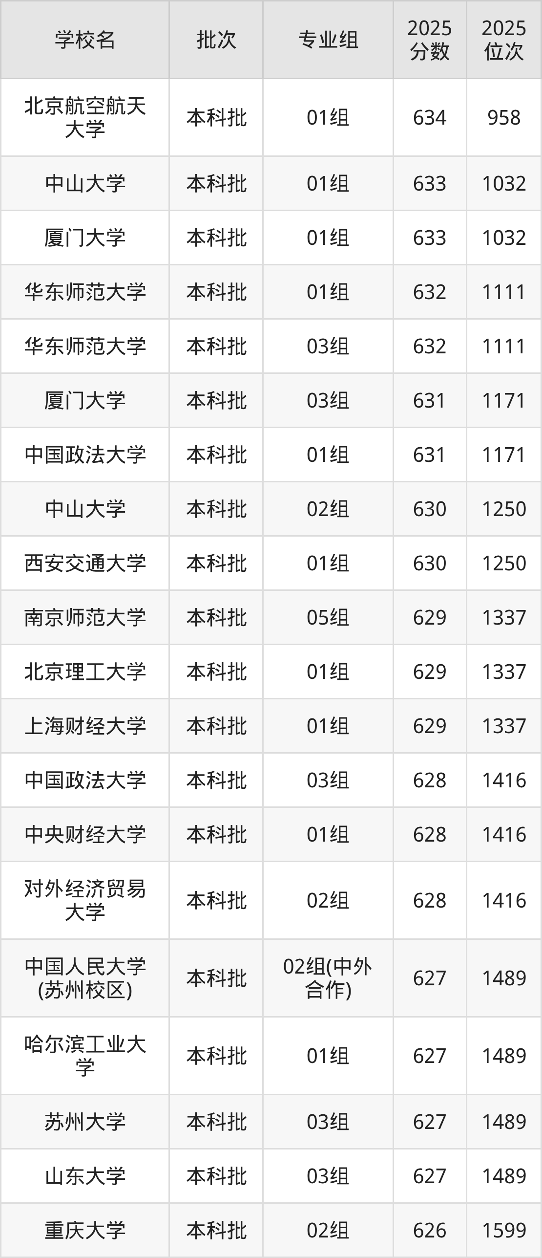 2025年江苏高考历史类627分(1417名~1489名)能上的大学有苏州大学03组、中国人民大学(苏州校区)02组(中外合作)、山东大学03组、哈尔滨工业大学01组。
