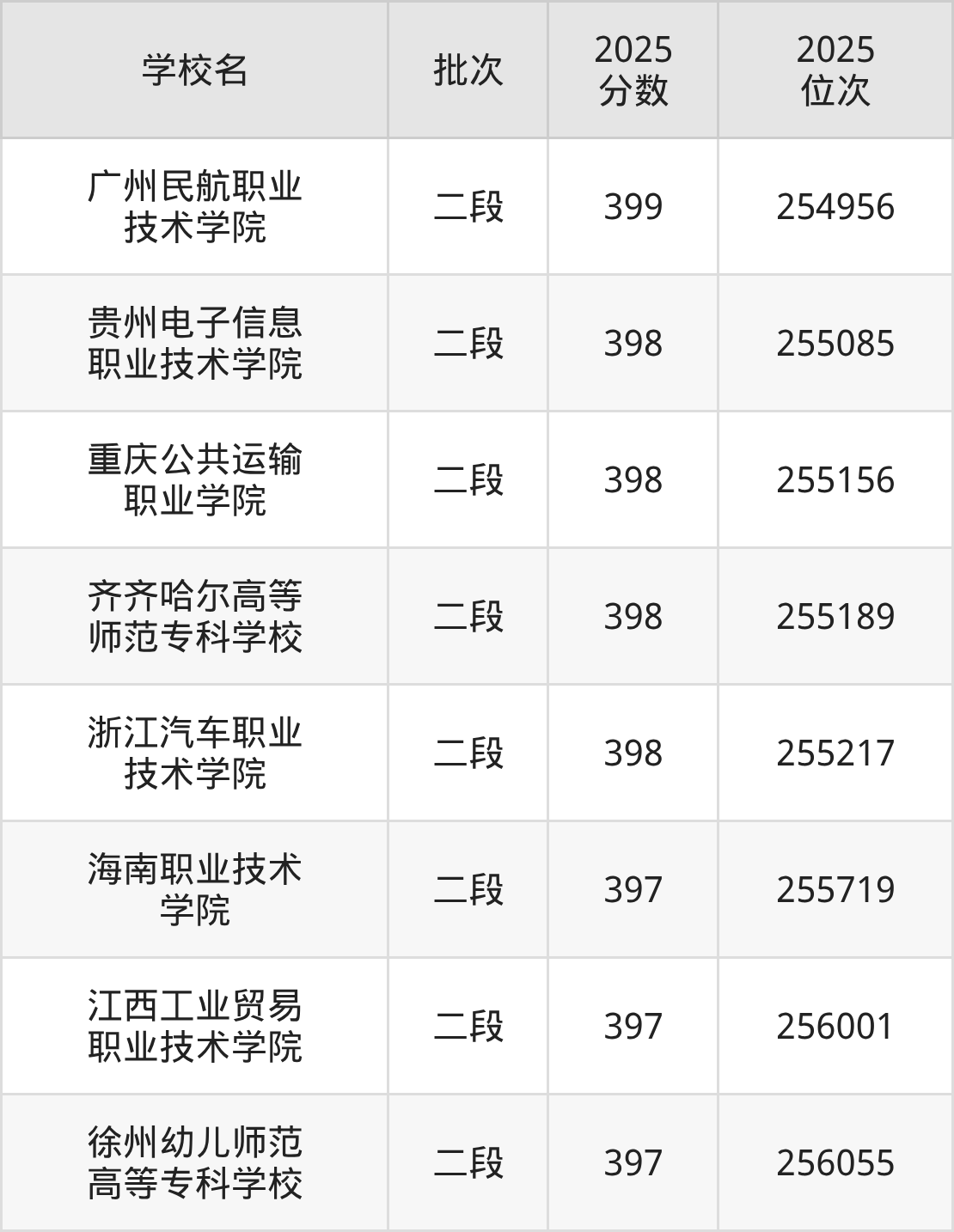 2025年浙江高考398分(255081名~255601名)能上的大学有齐齐哈尔高等师范专科学校、重庆公共运输职业学院、浙江汽车职业技术学院、贵州电子信息职业技术学院。