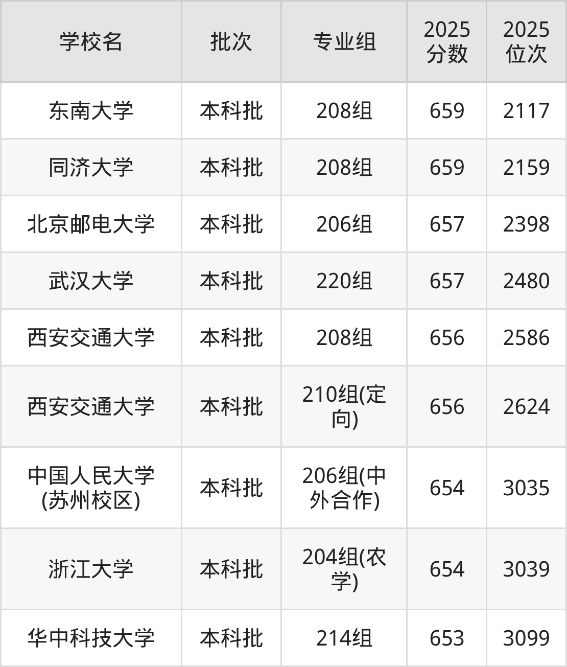 另外录取位次低于该区间(较稳妥)的有中国人民大学(苏州校区)206组(中外合作)(3035名)、浙江大学204组(农学)(3039名)等;录取位次高于该区间(可冲)的有武汉大学220组(2480名)、北京邮电大学206组(2398名)等。