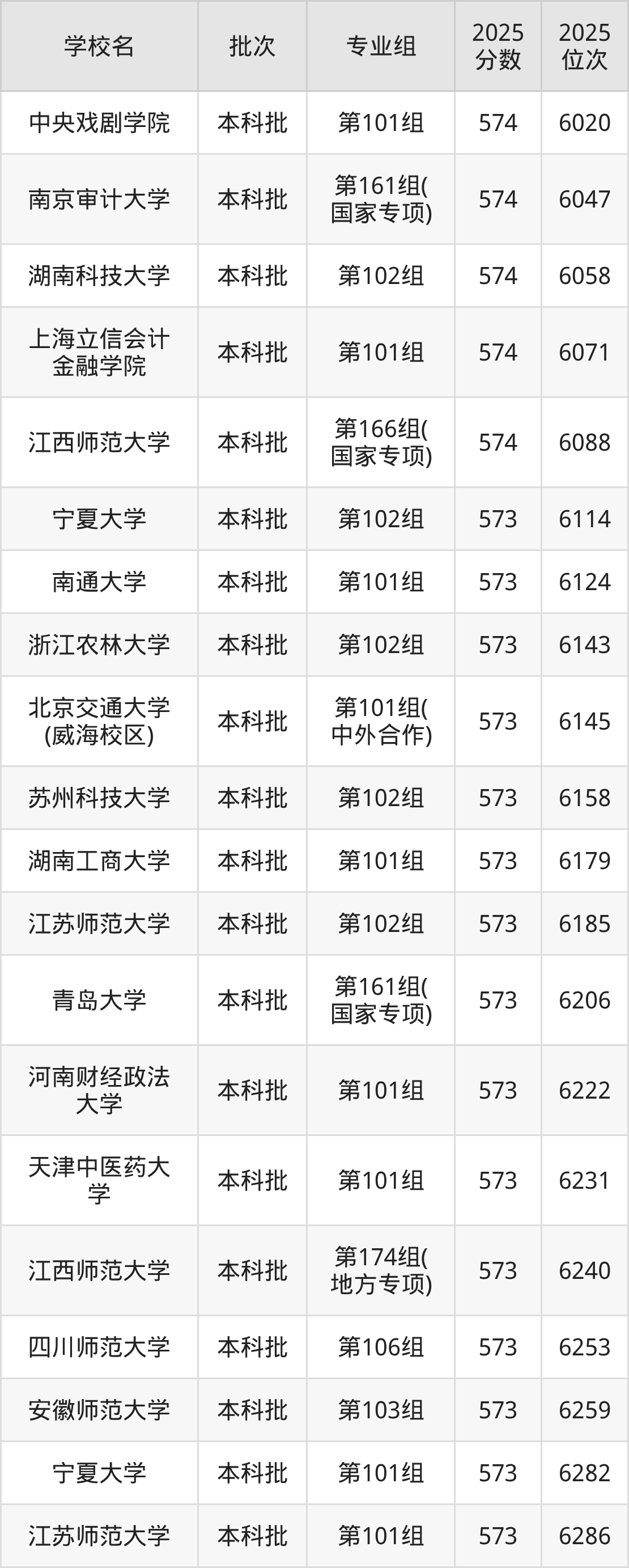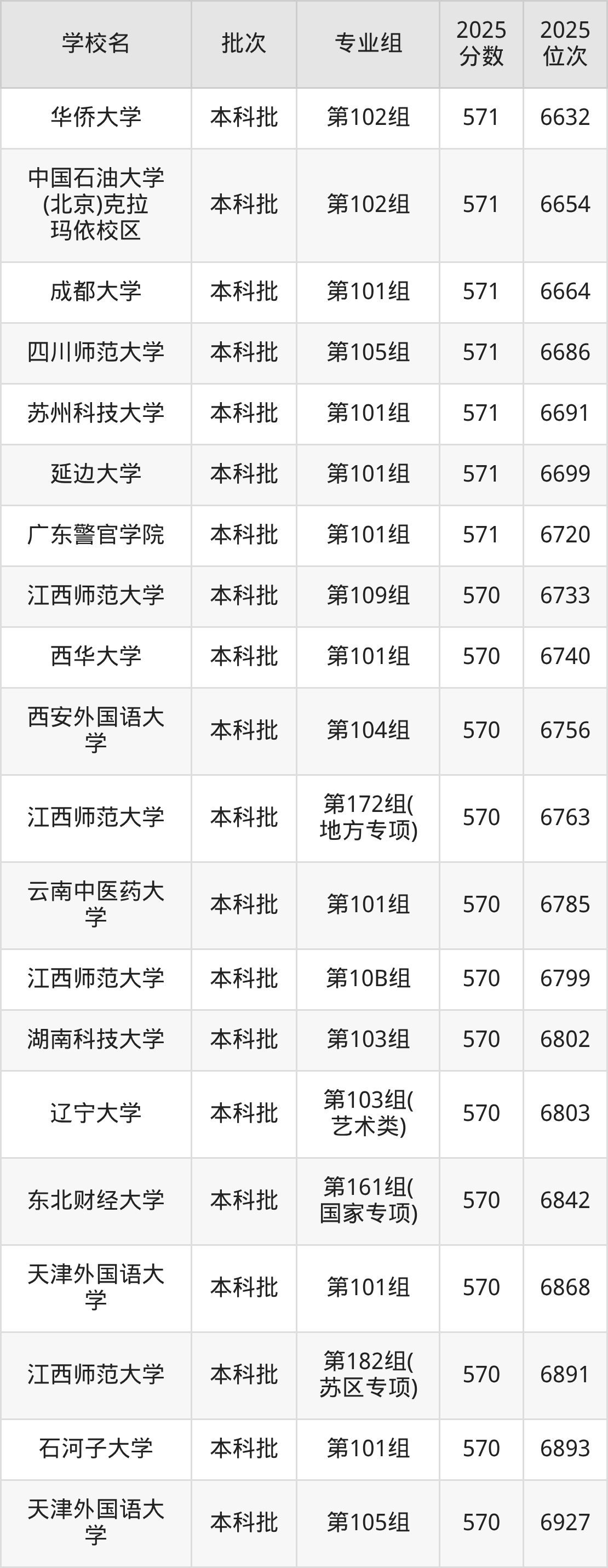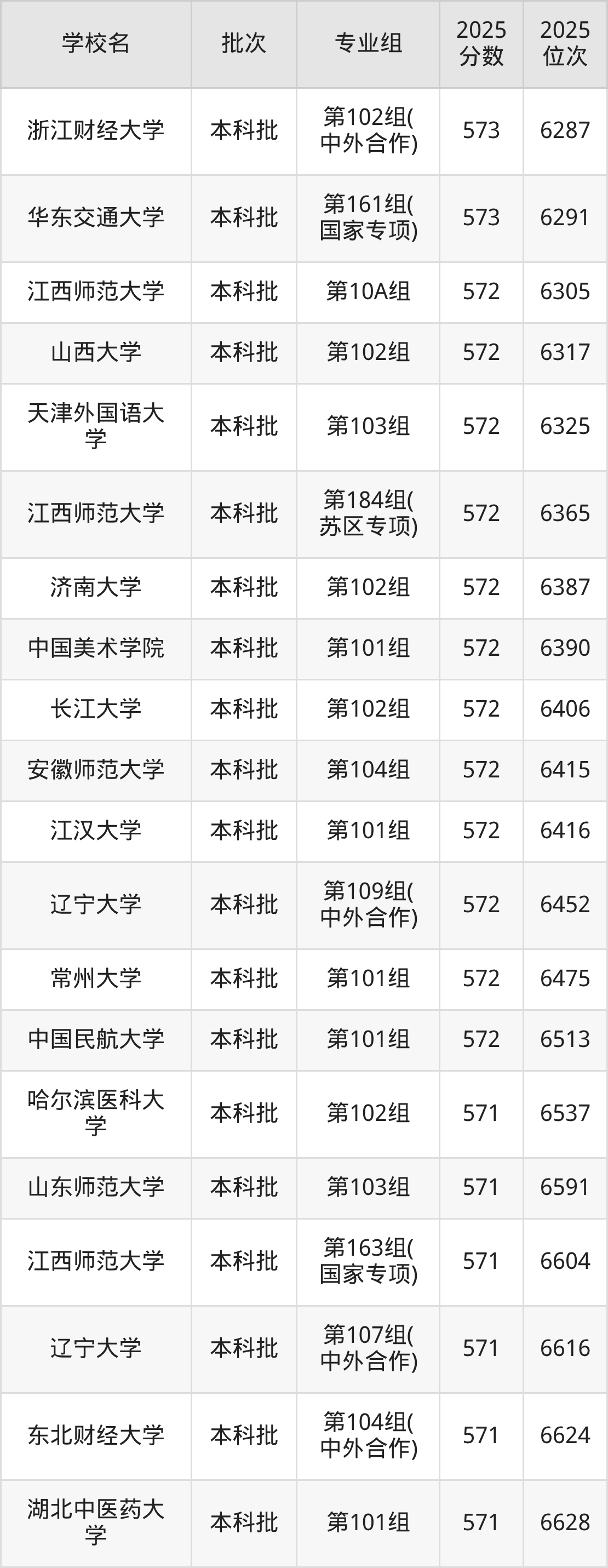 2025年江西高考历史类571分(6520名~6732名)能上的大学有山东师范大学第103组、四川师范大学第105组、东北财经大学第104组(中外合作)、辽宁大学第107组(中外合作)等。