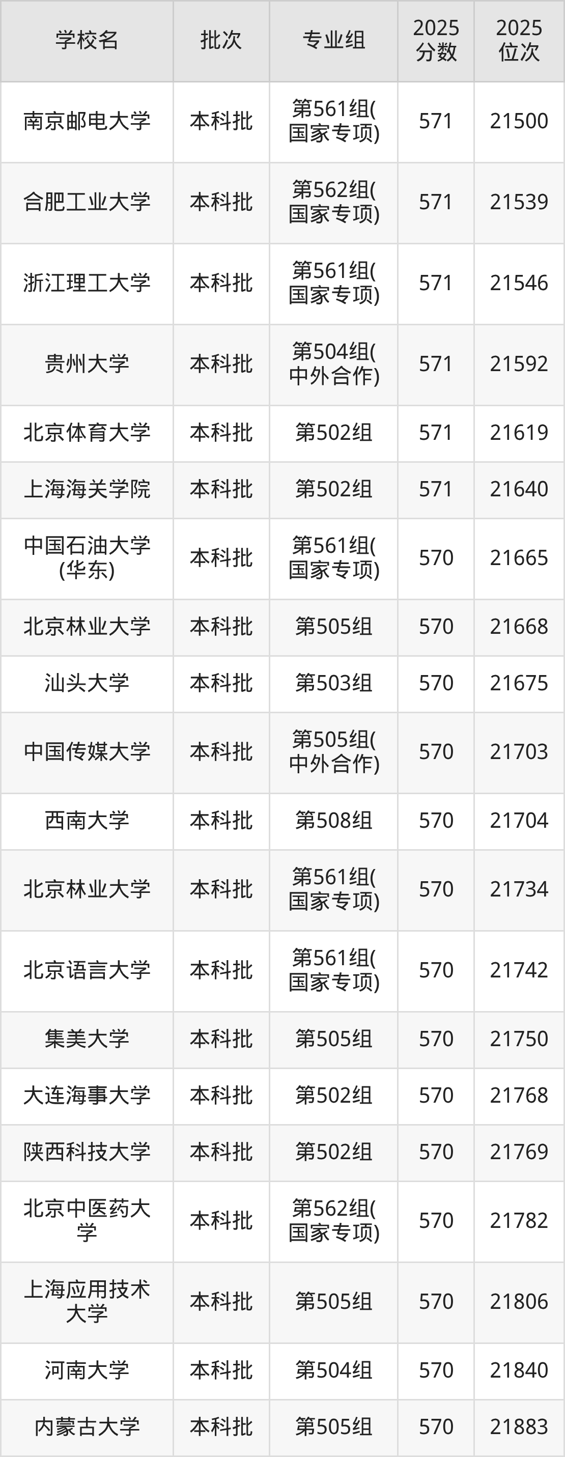 另外录取位次低于该区间(较稳妥)的有中国石油大学(华东)第561组(国家专项)(21665名)、北京林业大学第505组(21668名)等;录取位次高于该区间(可冲)的有中国石油大学(华东)第502组(21114名)、贵州大学第509组(21056名)等。