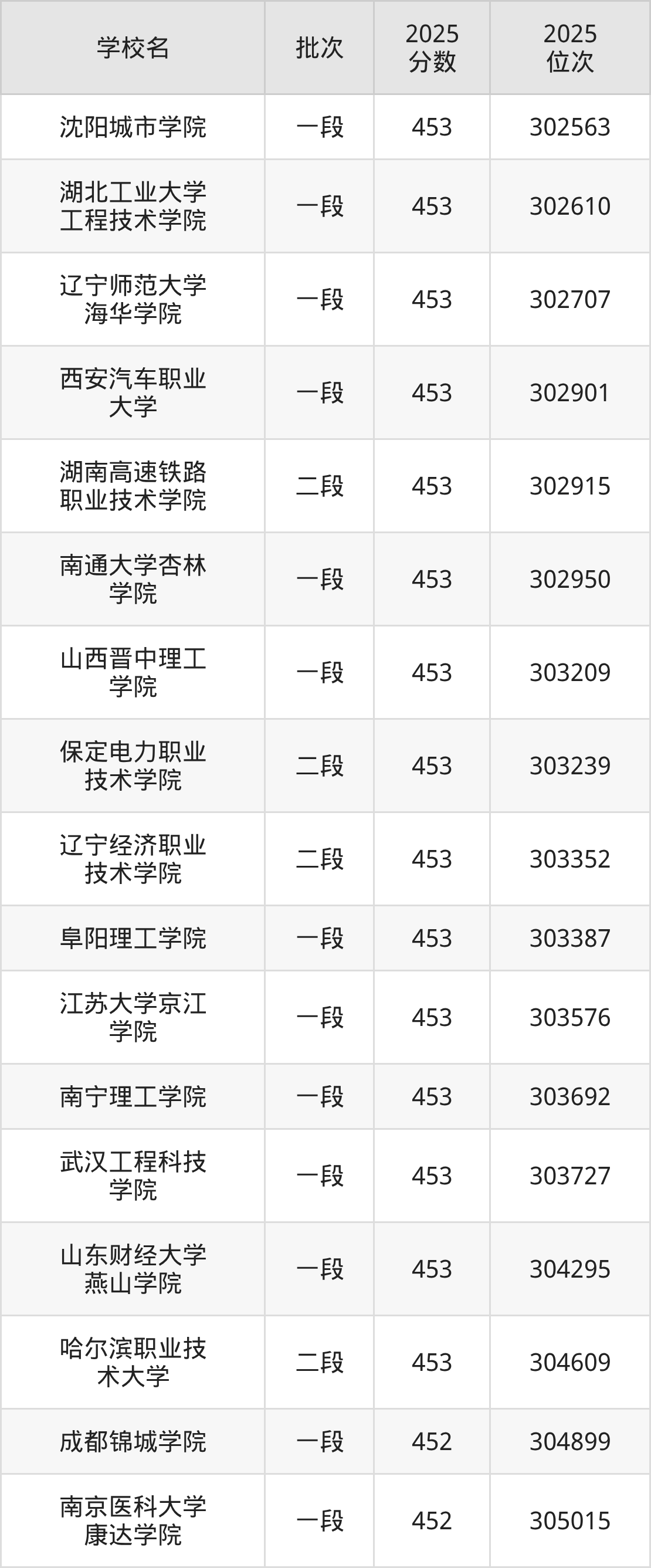 2025年山东高考453分(302231名~304736名)能上的大学有保定电力职业技术学院、辽宁师范大学海华学院、湖南高速铁路职业技术学院、武汉工程科技学院等。