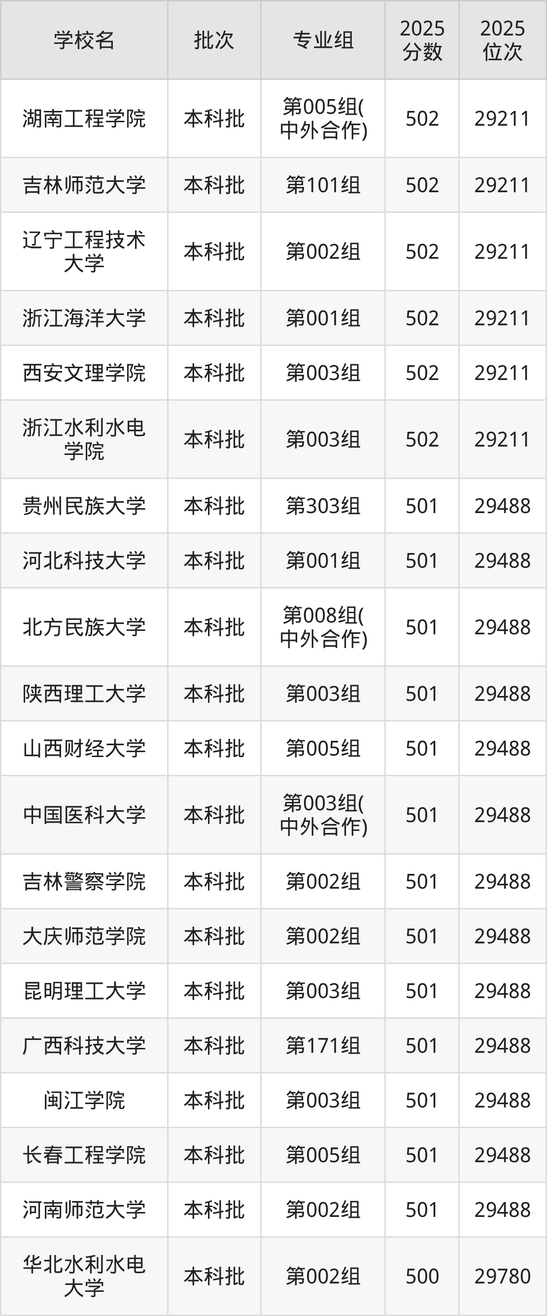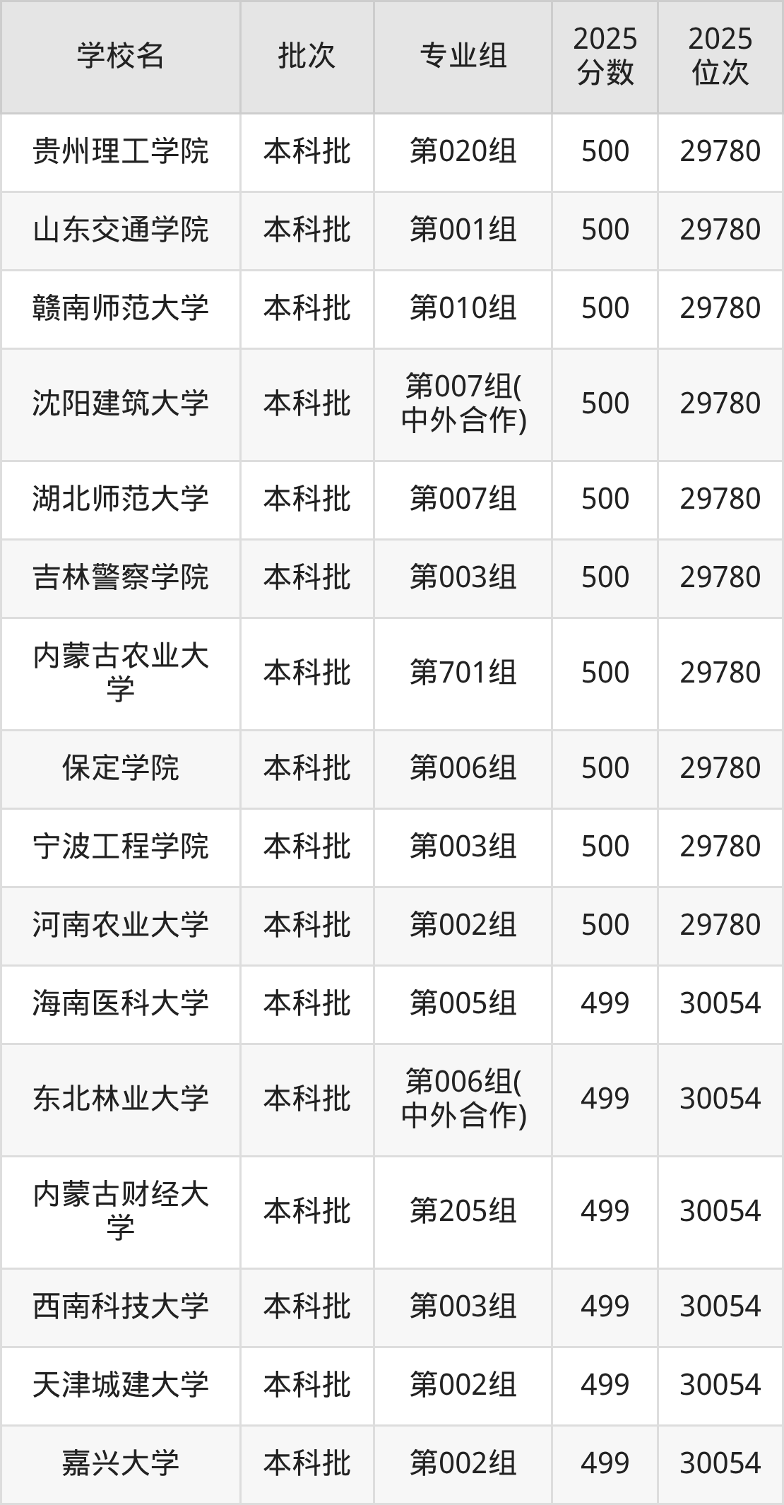 2025年内蒙古高考物理类500分(29489名~29780名)能上的大学有沈阳建筑大学第007组(中外合作)、华北水利水电大学第002组、内蒙古农业大学第701组、山东交通学院第001组等。
