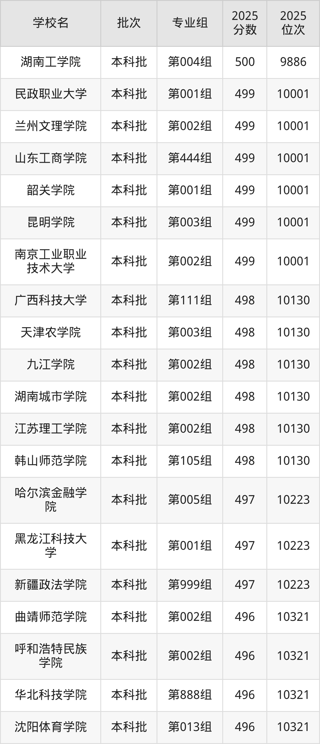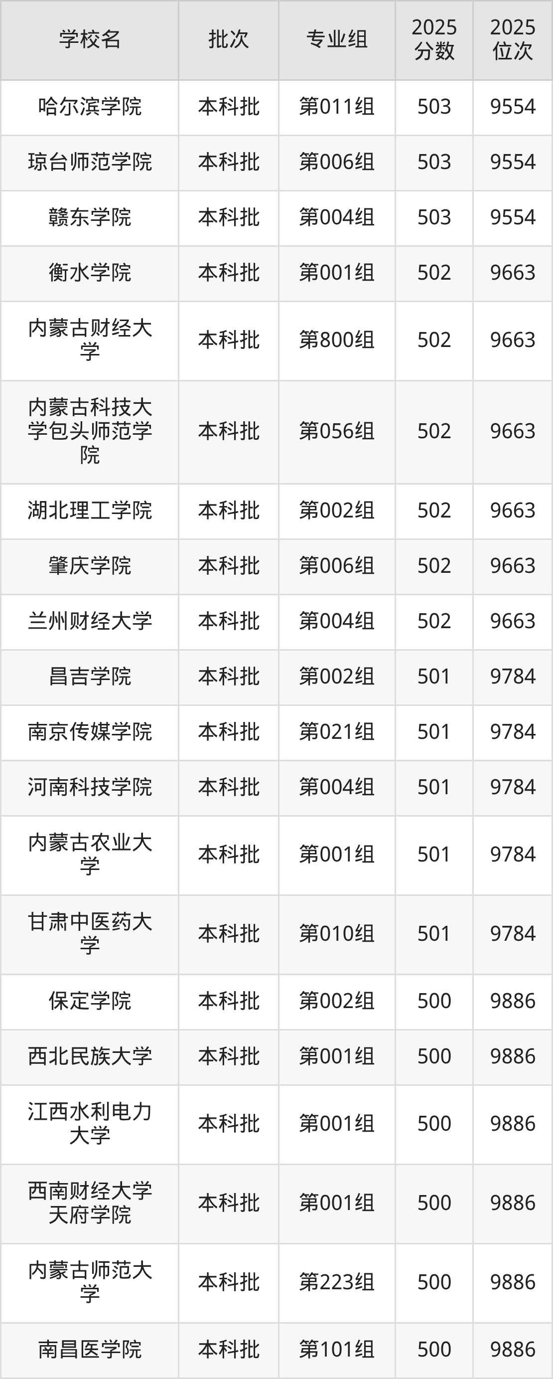 2025年内蒙古高考历史类500分(9785名~9886名)能上的大学有西北民族大学第001组、保定学院第002组、江西水利电力大学第001组、西南财经大学天府学院第001组等。