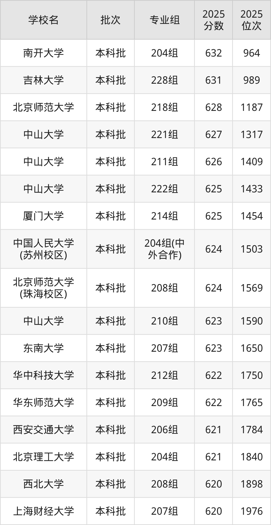 2025年广东高考历史类625分(1418名~1494名)能上的大学有厦门大学214组、中山大学222组。