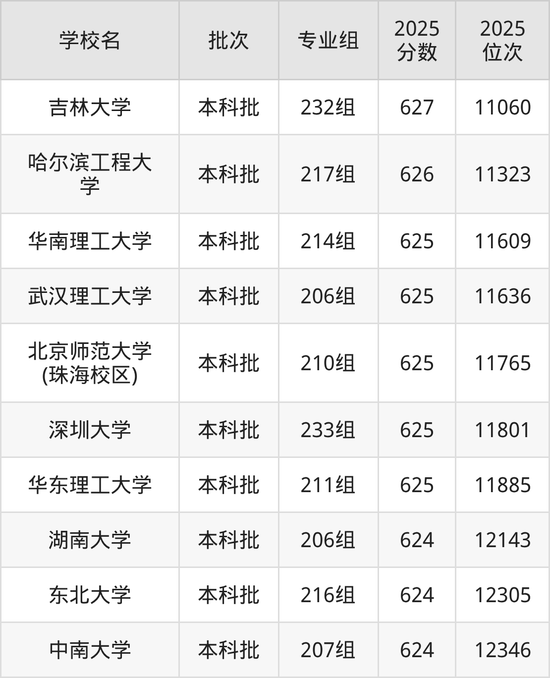 另外录取位次低于该区间(较稳妥)的有湖南大学206组(12143名)、东北大学216组(12305名)等;录取位次高于该区间(可冲)的有哈尔滨工程大学217组(11323名)、吉林大学232组(11060名)等。