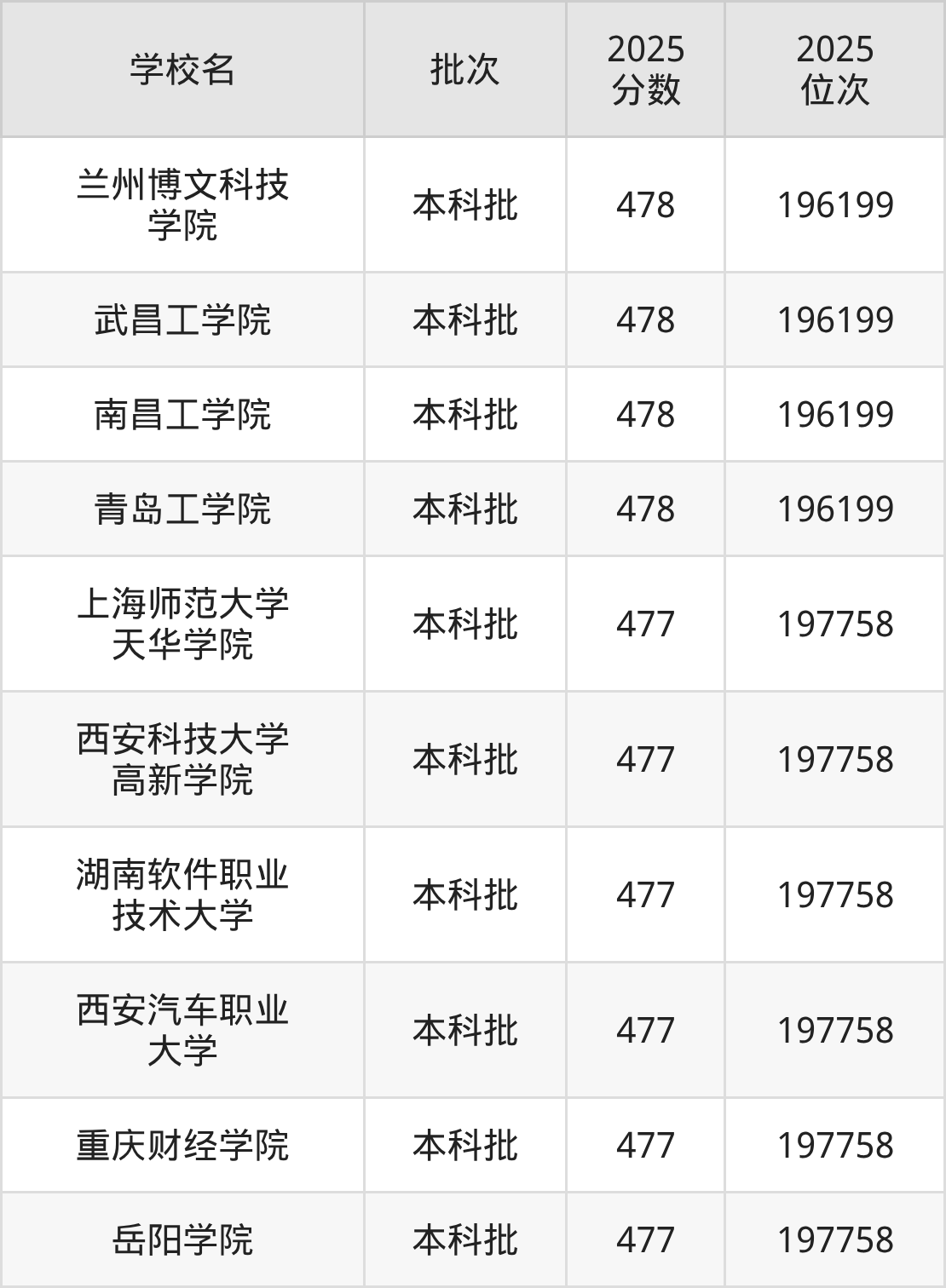 2025年河北高考物理类477分(196200名~197758名)能上的大学有上海师范大学天华学院、岳阳学院、西安汽车职业大学、西安科技大学高新学院等。