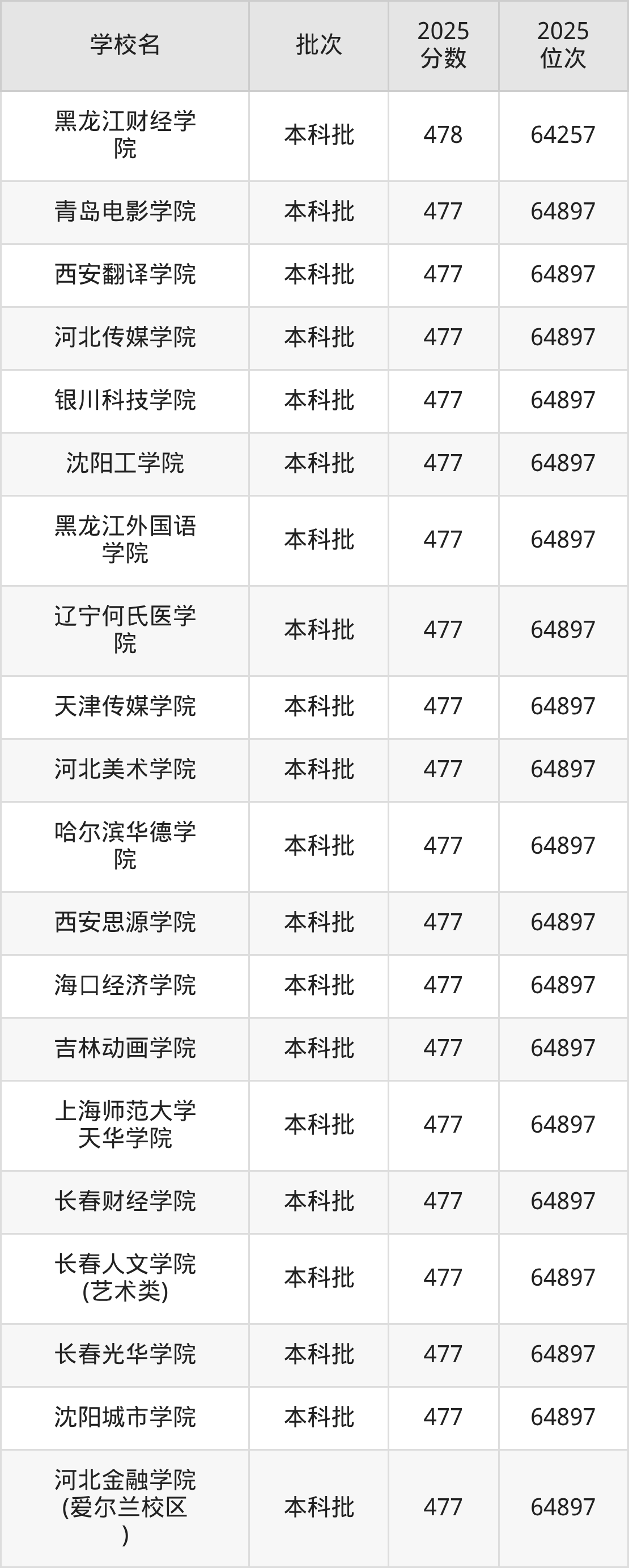 2025年河北高考历史类477分(64258名~64897名)能上的大学有长春人文学院(艺术类)、长春财经学院、吉林动画学院、西安思源学院等。