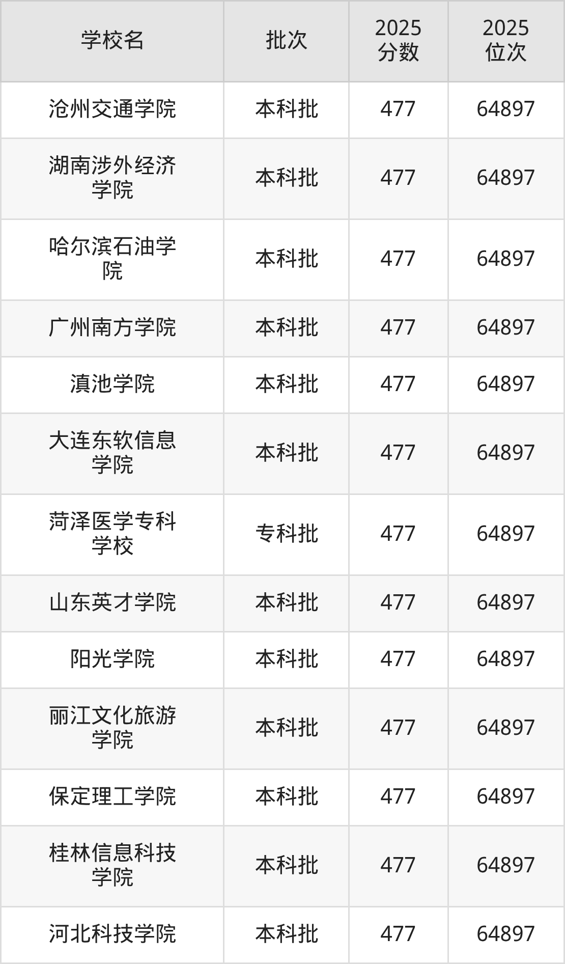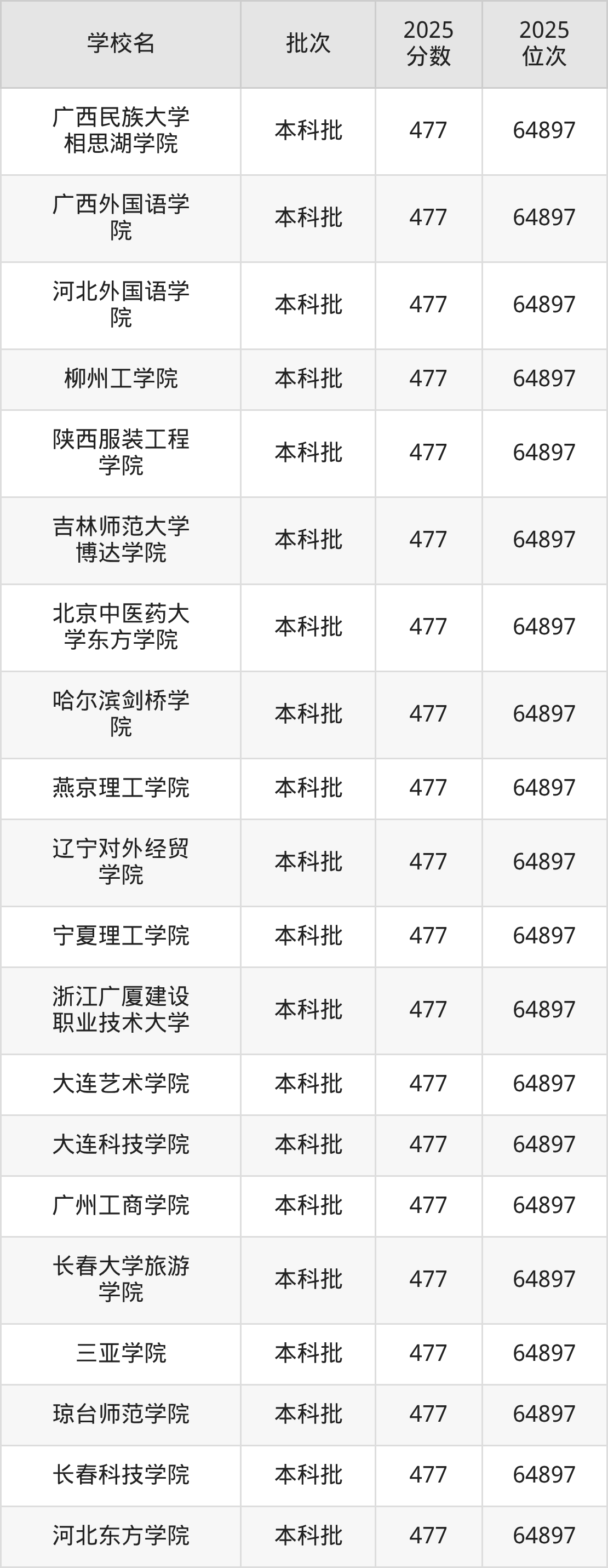 河北高考477分:历史类排名64897位、物理类排名197758位。该分数位次对应能上的大学历史类有长春人文学院(艺术类)、长春财经学院;物理类有上海师范大学天华学院、岳阳学院,更多名单如下文所示,2026届考生可参考。