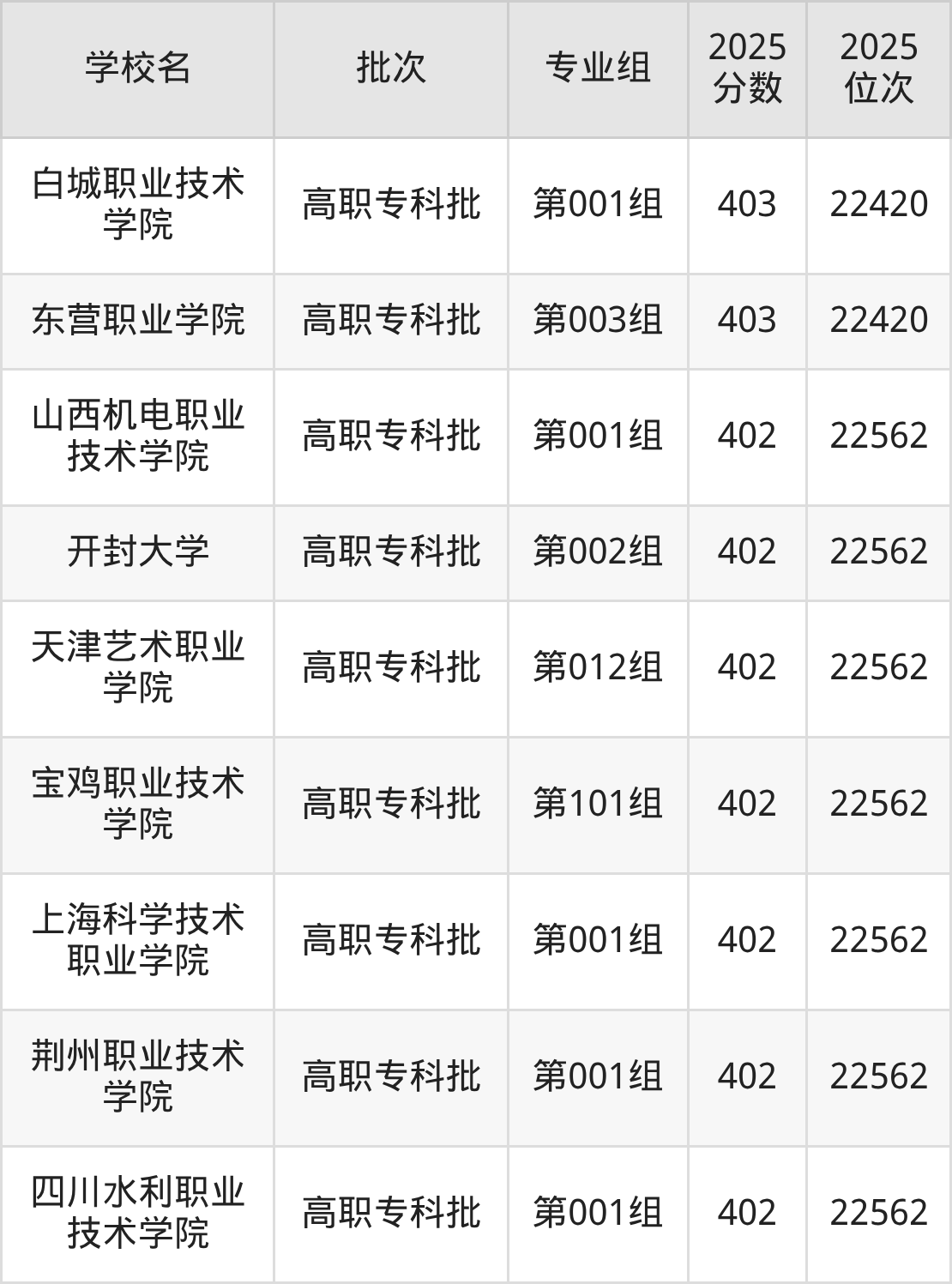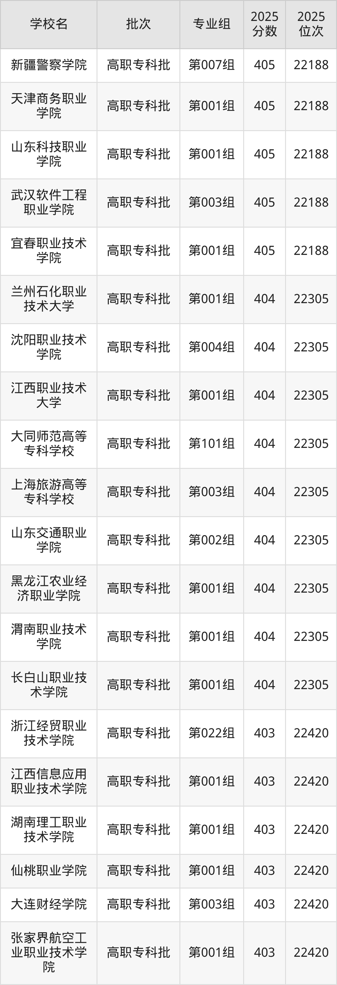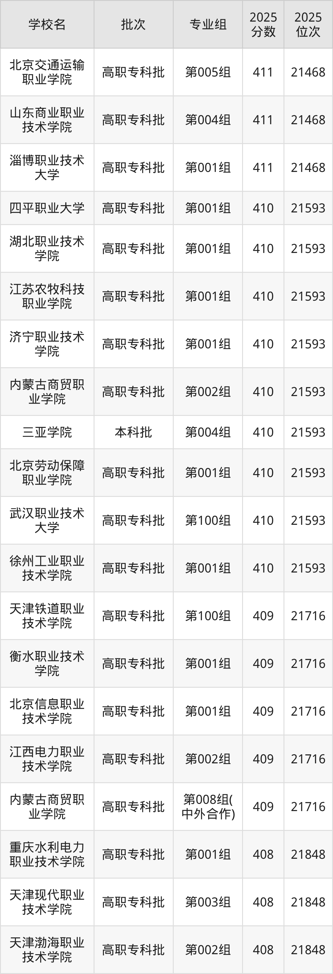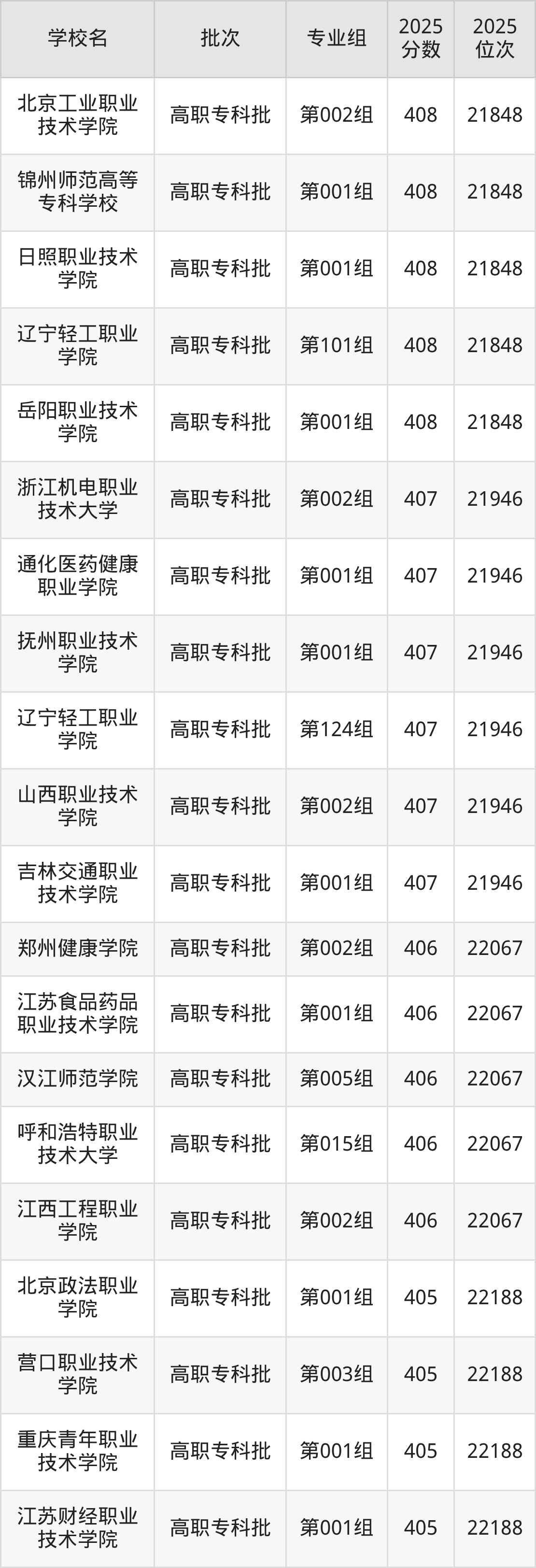 2025年内蒙古高考历史类406分(21947名~22067名)能上的大学有江西工程职业学院第002组、呼和浩特职业技术大学第015组、汉江师范学院第005组、江苏食品药品职业技术学院第001组等。