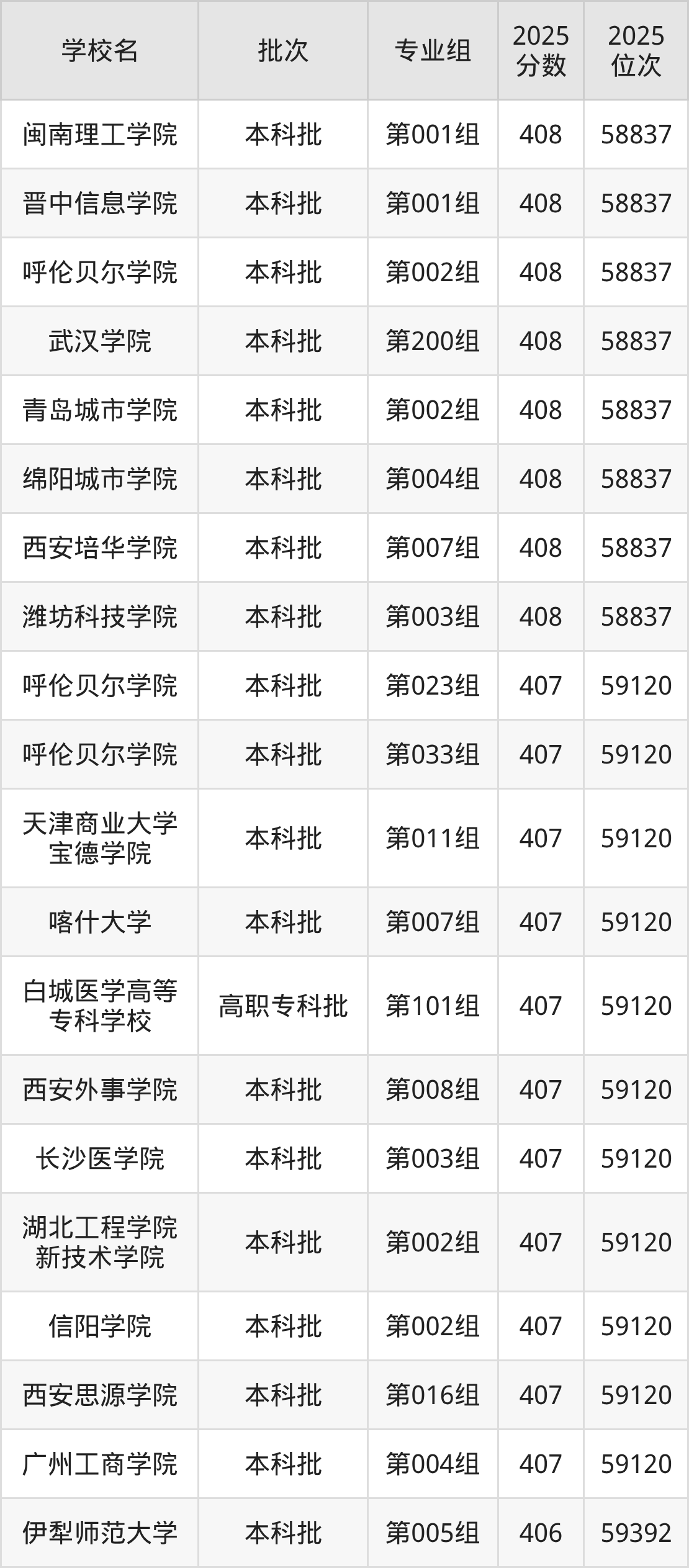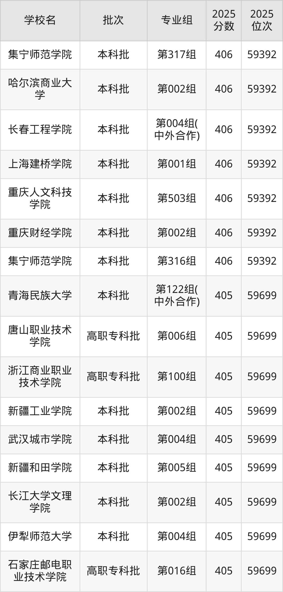 2025年内蒙古高考物理类406分(59121名~59392名)能上的大学有集宁师范学院第317组、集宁师范学院第316组、重庆财经学院第002组、重庆人文科技学院第503组等。