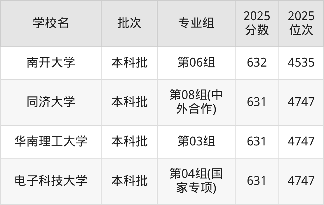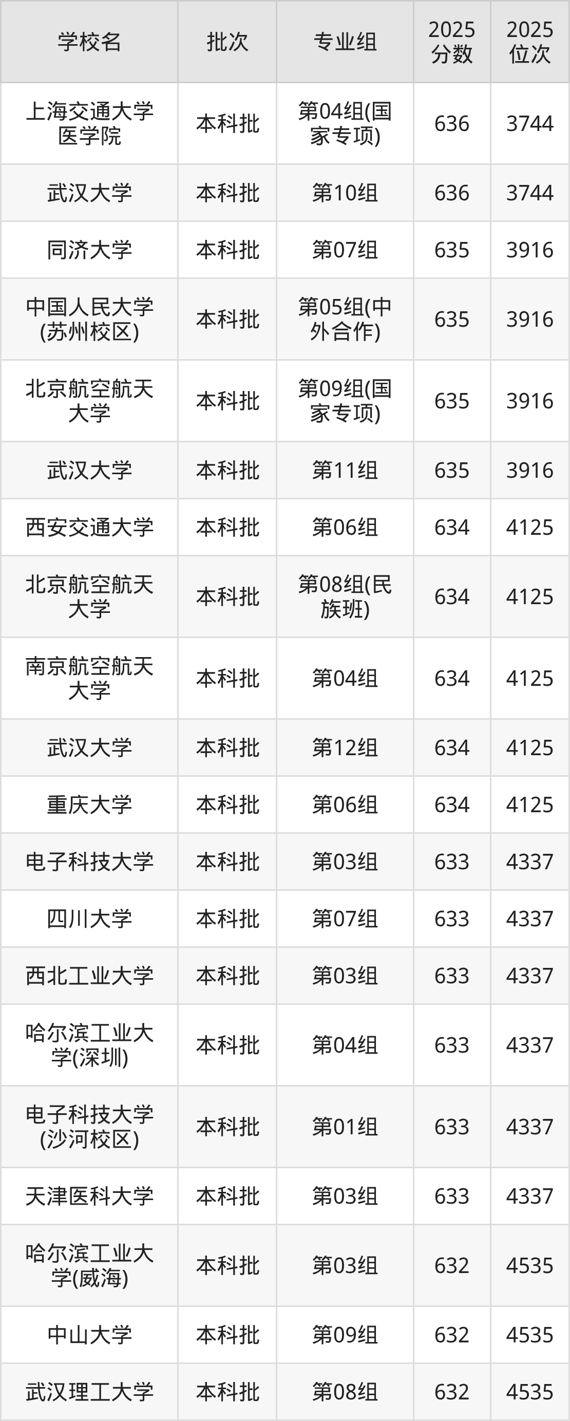 2025年湖北高考物理类633分(4126名~4337名)能上的大学有四川大学第07组、电子科技大学第03组、西北工业大学第03组、哈尔滨工业大学(深圳)第04组等。