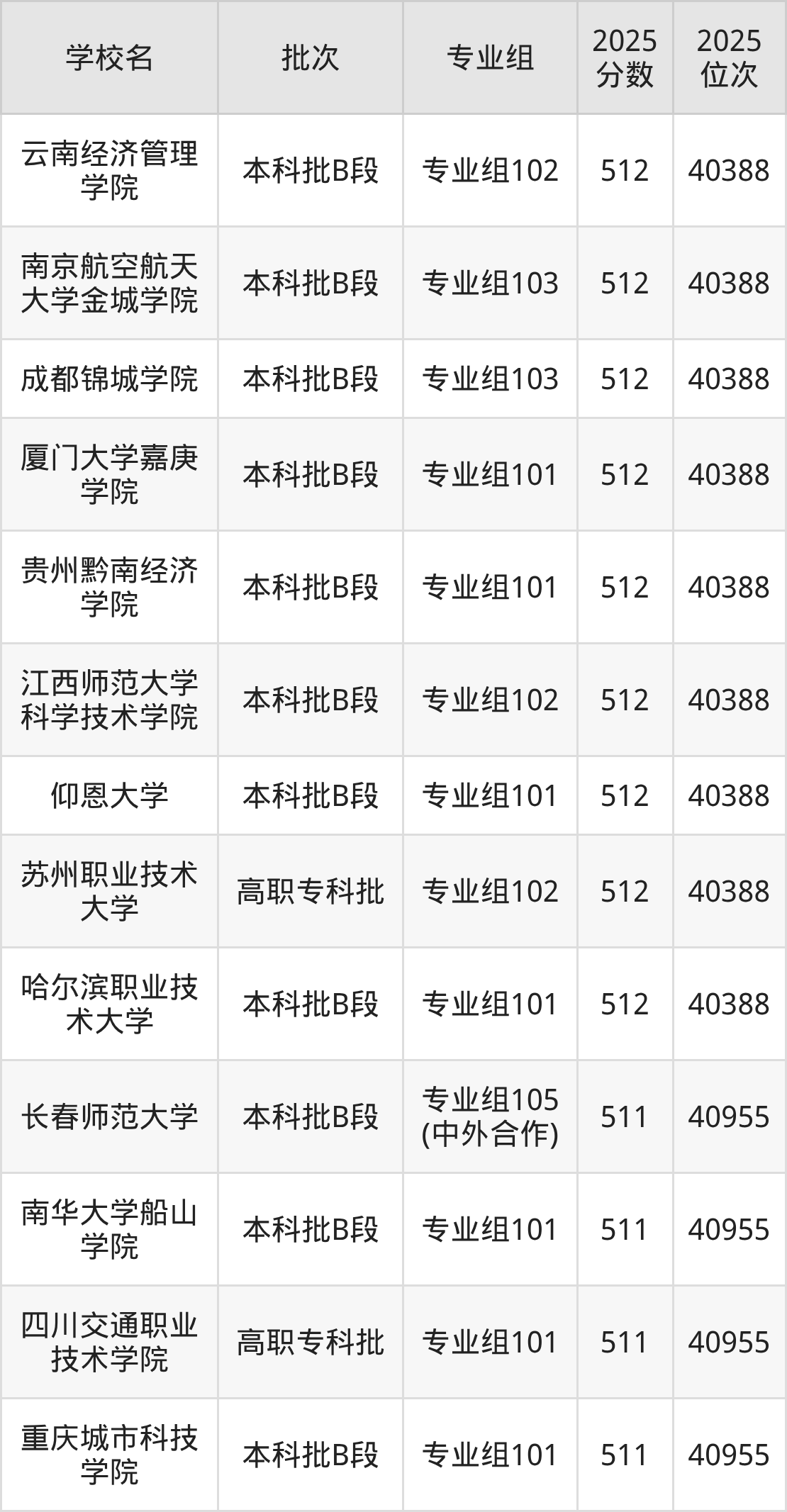 2025年四川高考历史类511分(40389名~40955名)能上的大学有四川交通职业技术学院专业组101、南华大学船山学院专业组101、重庆城市科技学院专业组101、长春师范大学专业组105(中外合作)。