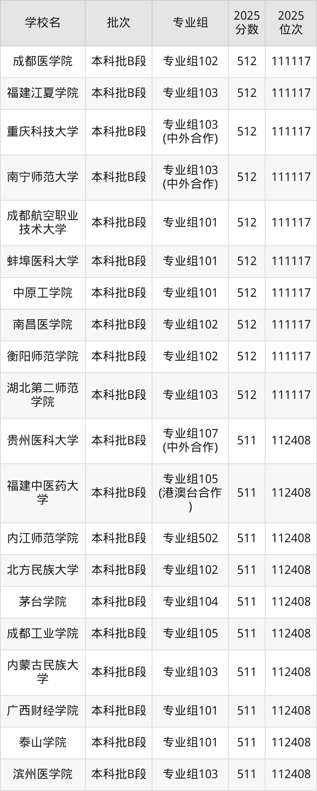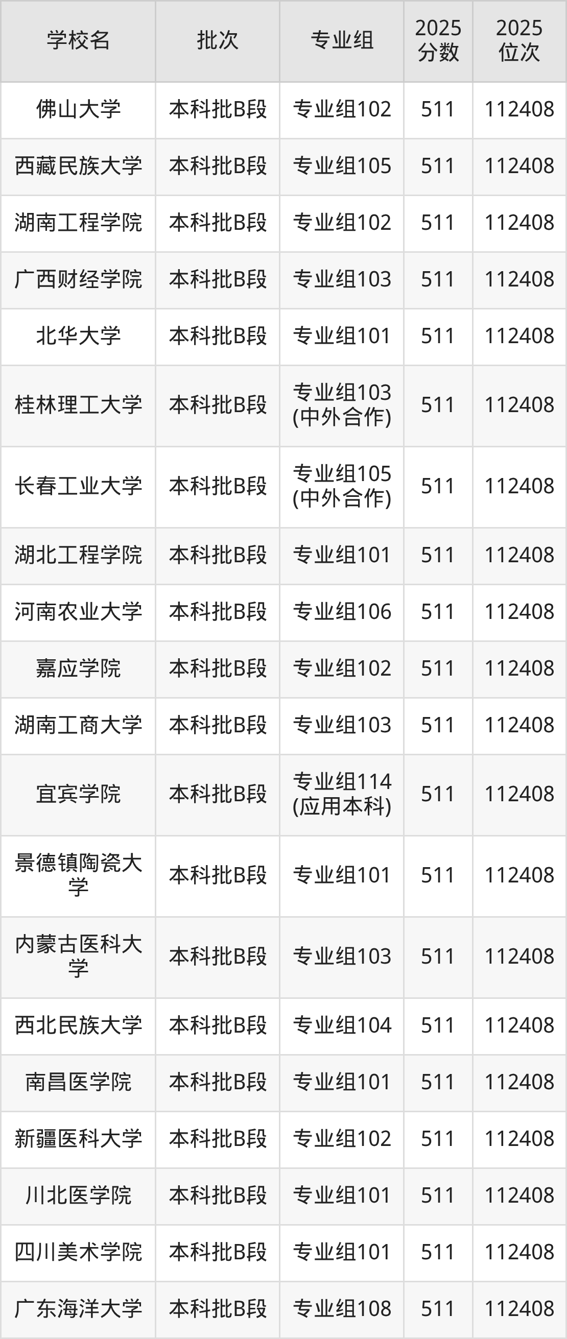 2025年四川高考物理类511分(111118名~112408名)能上的大学有景德镇陶瓷大学专业组101、北华大学专业组101、桂林理工大学专业组103(中外合作)、贵州医科大学专业组107(中外合作)等。