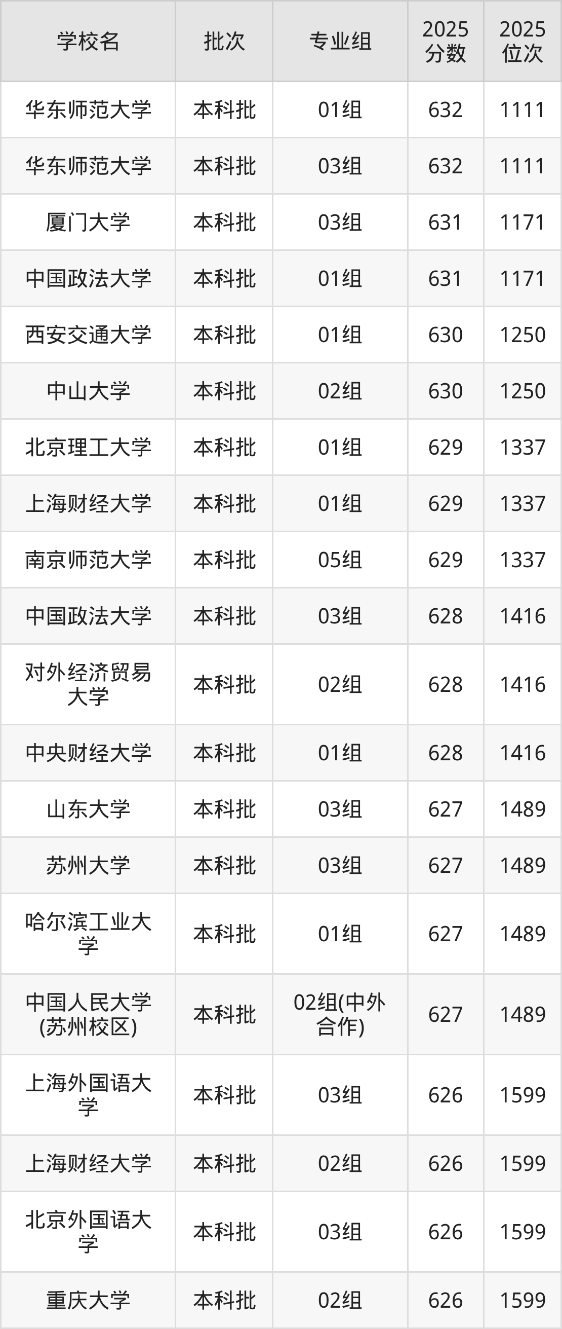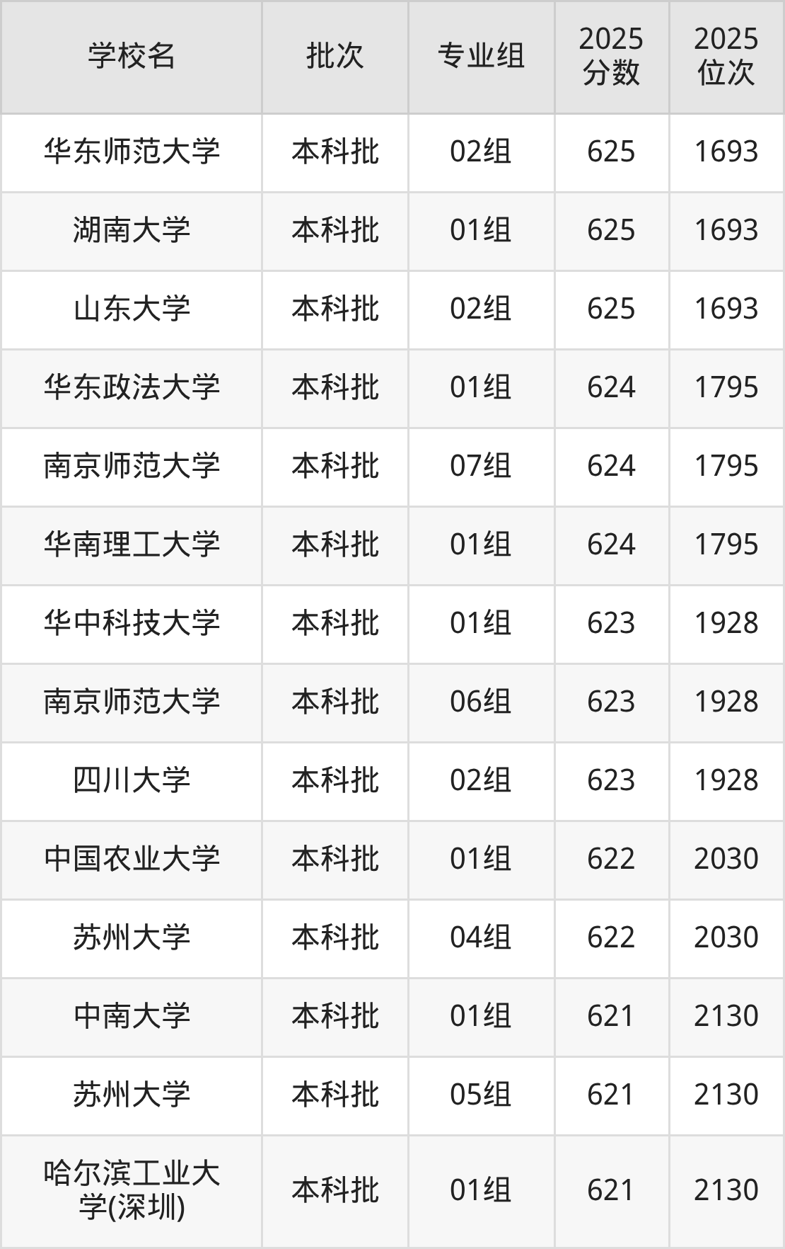 2025年江苏高考历史类625分(1600名~1693名)能上的大学有华东师范大学02组、山东大学02组、湖南大学01组。