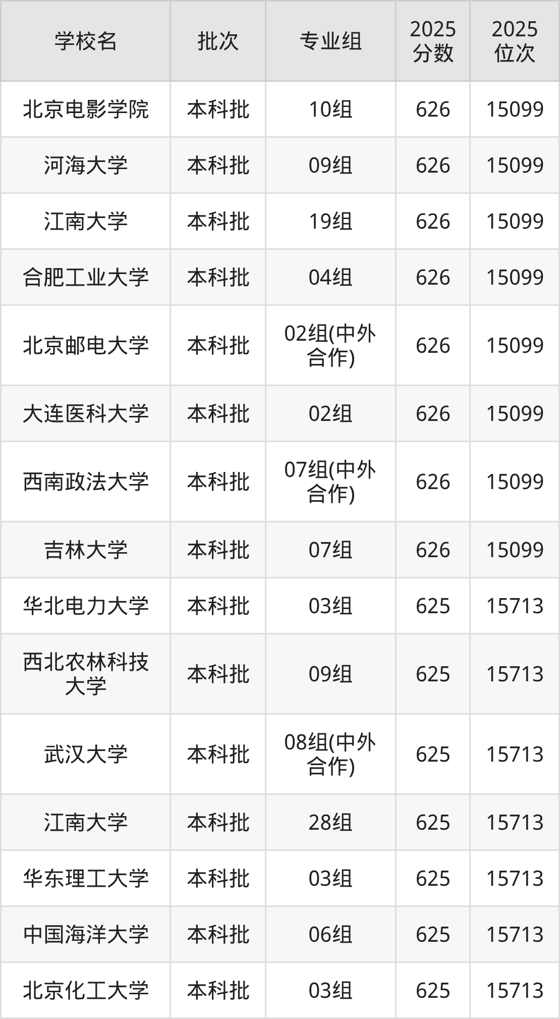 2025年江苏高考物理类625分(15100名~15713名)能上的大学有江南大学28组、华东理工大学03组、中国海洋大学06组、北京化工大学03组等。