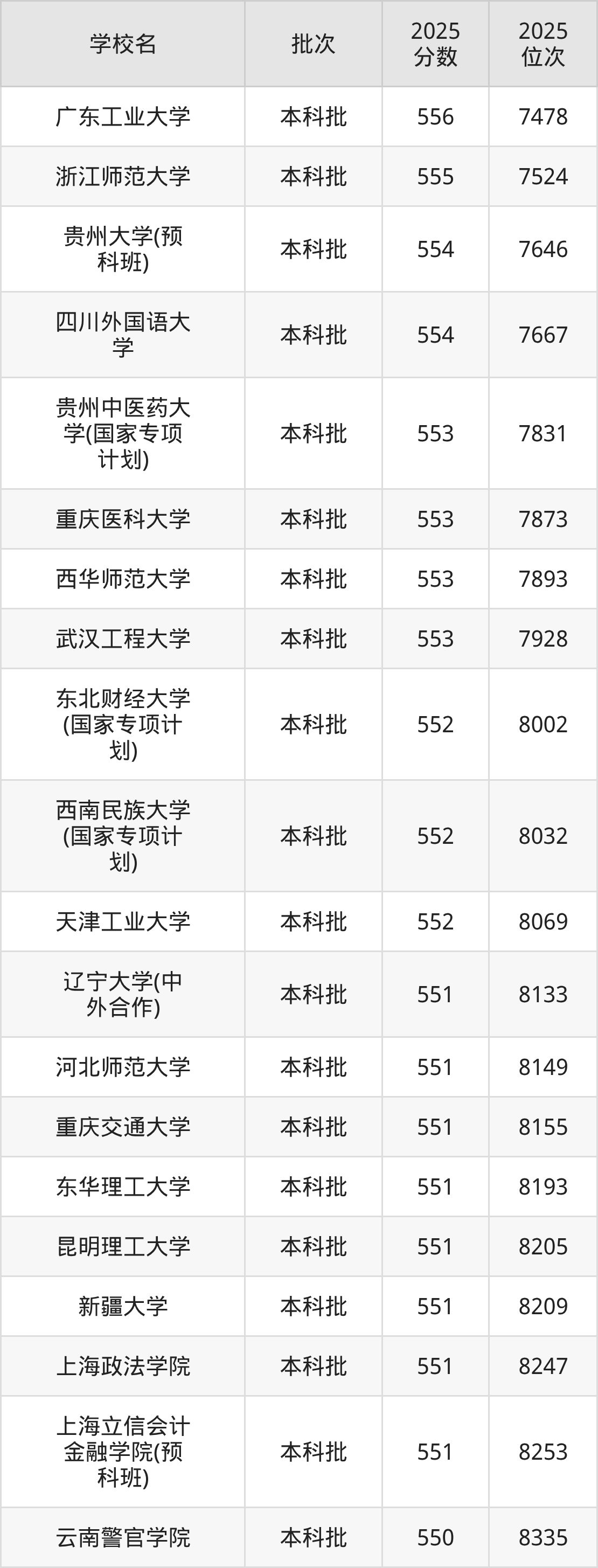 二、贵州552分位次排名能上的大学