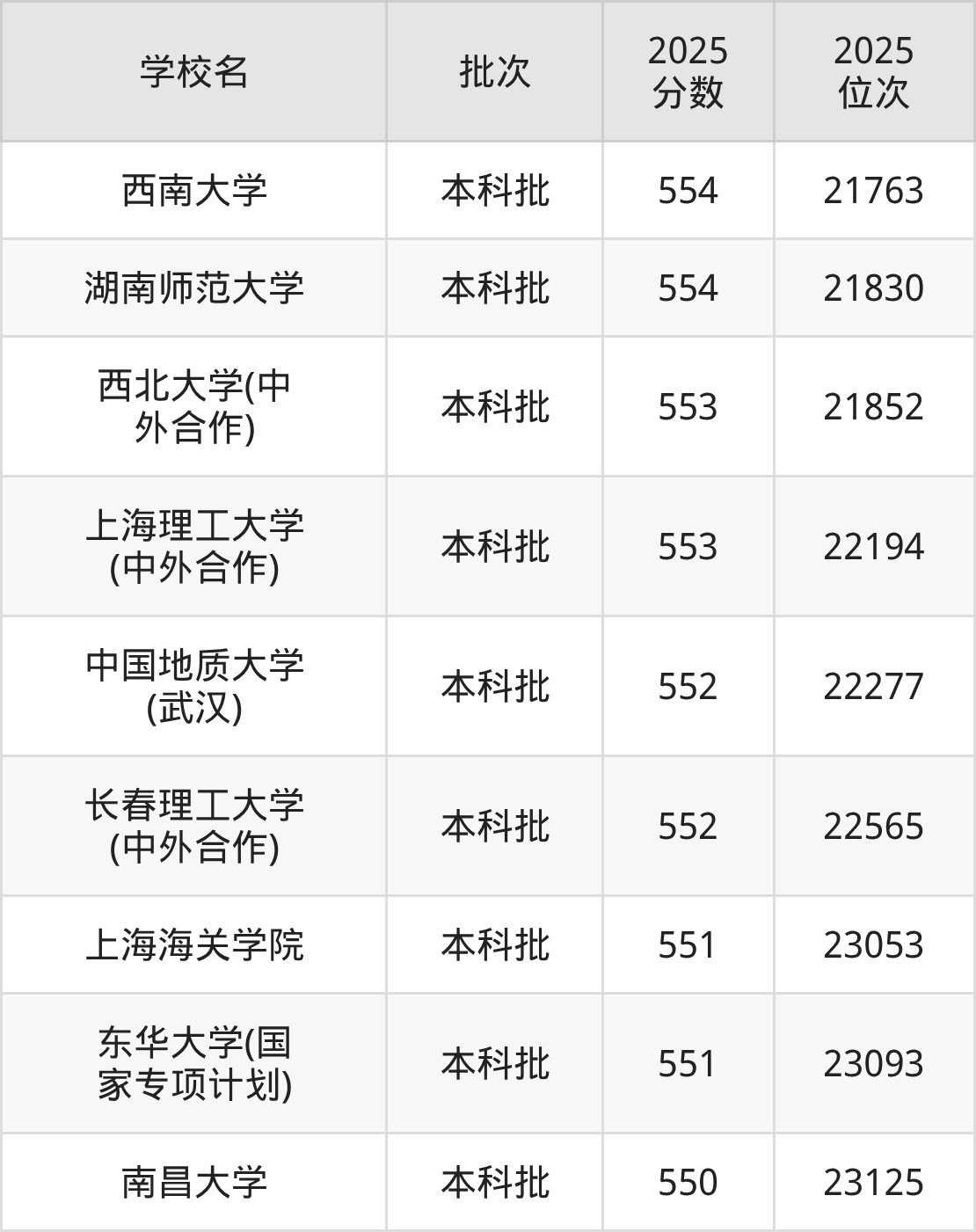 2025年贵州高考物理类552分(22254名~22660名)能上的大学有长春理工大学(中外合作)、中国地质大学(武汉)。