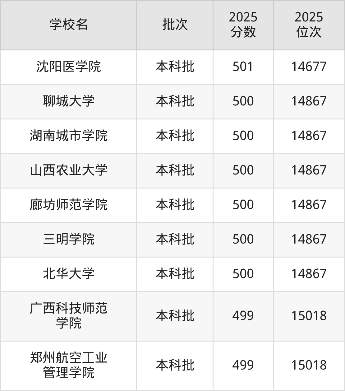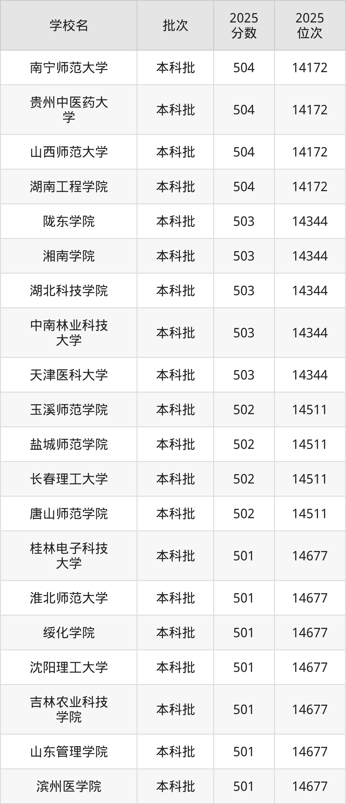 2025年辽宁高考历史类501分(14512名~14677名)能上的大学有吉林农业科技学院、桂林电子科技大学、沈阳医学院、滨州医学院等。
