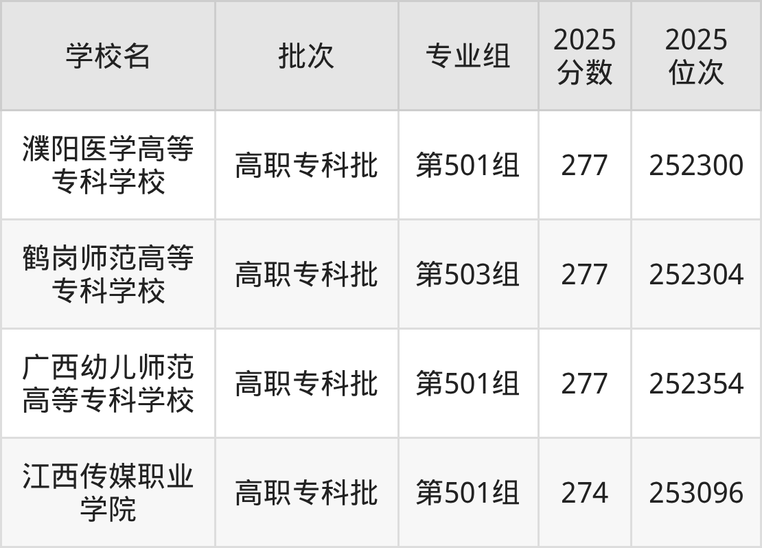 2025年江西高考物理类275分(252684名~252922名)录取位次低于该区间(较稳妥)的有江西传媒职业学院第501组(253096名)、喀什职业技术学院第502组(253700名)等;录取位次高于该区间(可冲)的有广西幼儿师范高等专科学校第501组(252354名)、鹤岗师范高等专科学校第503组(252304名)等。