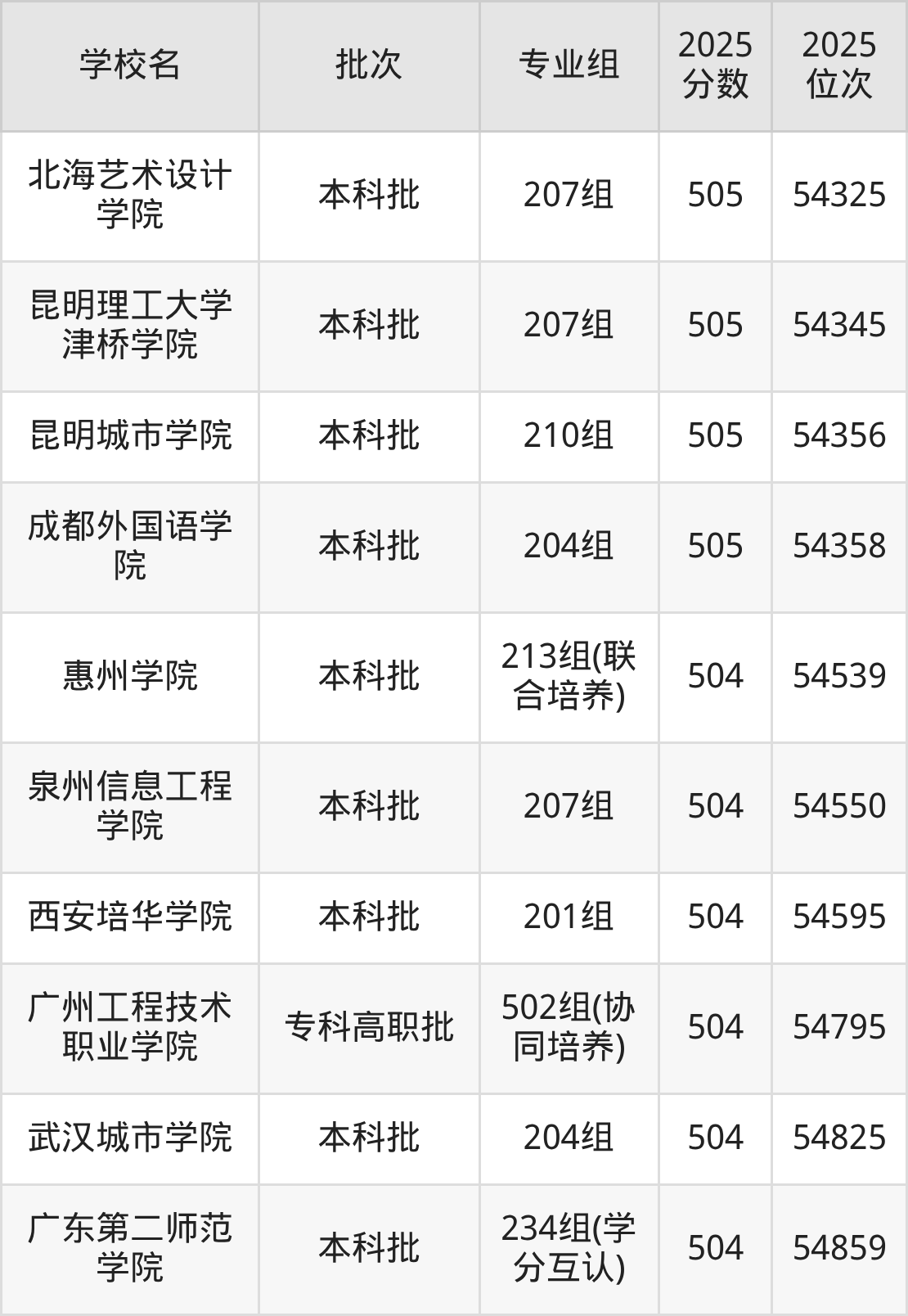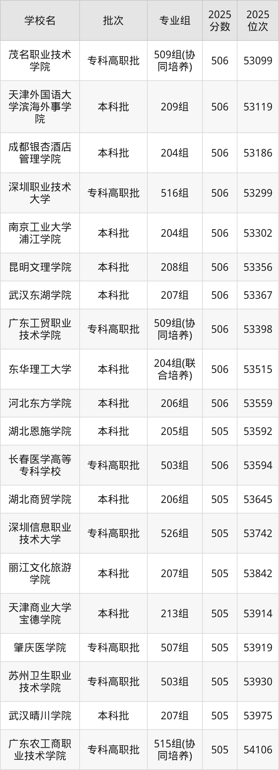 2025年广东高考历史类505分(53590名~54378名)能上的大学有武汉晴川学院207组、湖北商贸学院206组、湖北恩施学院205组、丽江文化旅游学院207组等。