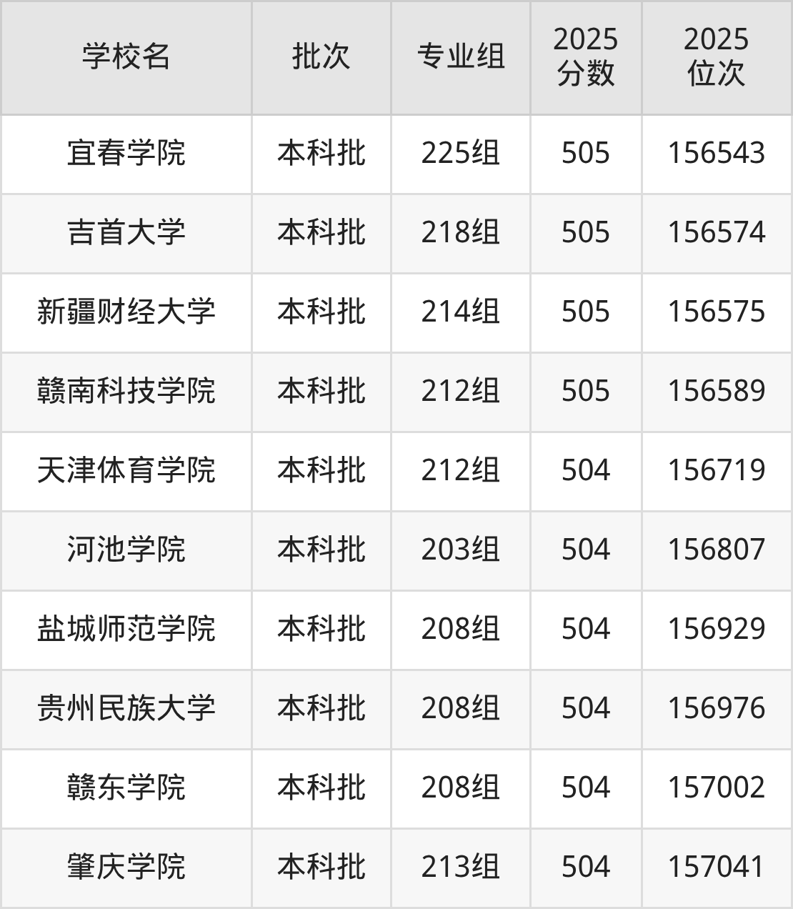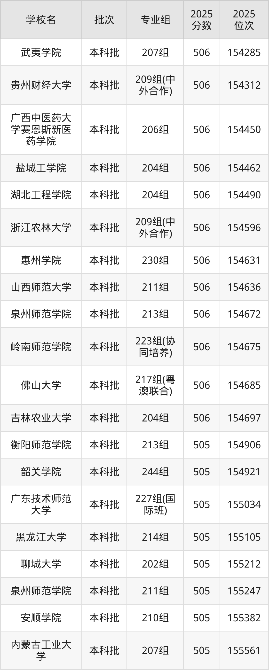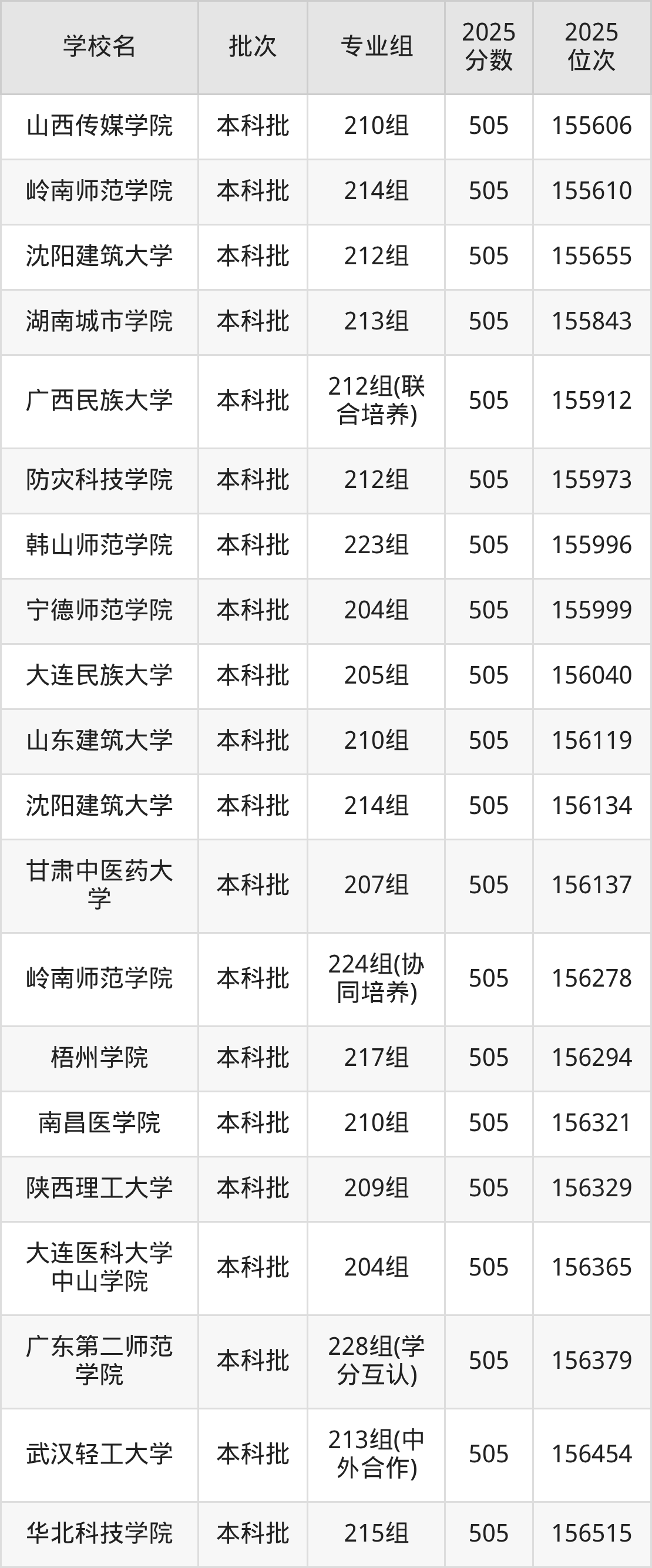 2025年广东高考物理类505分(154773名~156639名)能上的大学有内蒙古工业大学207组、沈阳建筑大学212组、沈阳建筑大学214组、黑龙江大学214组等。