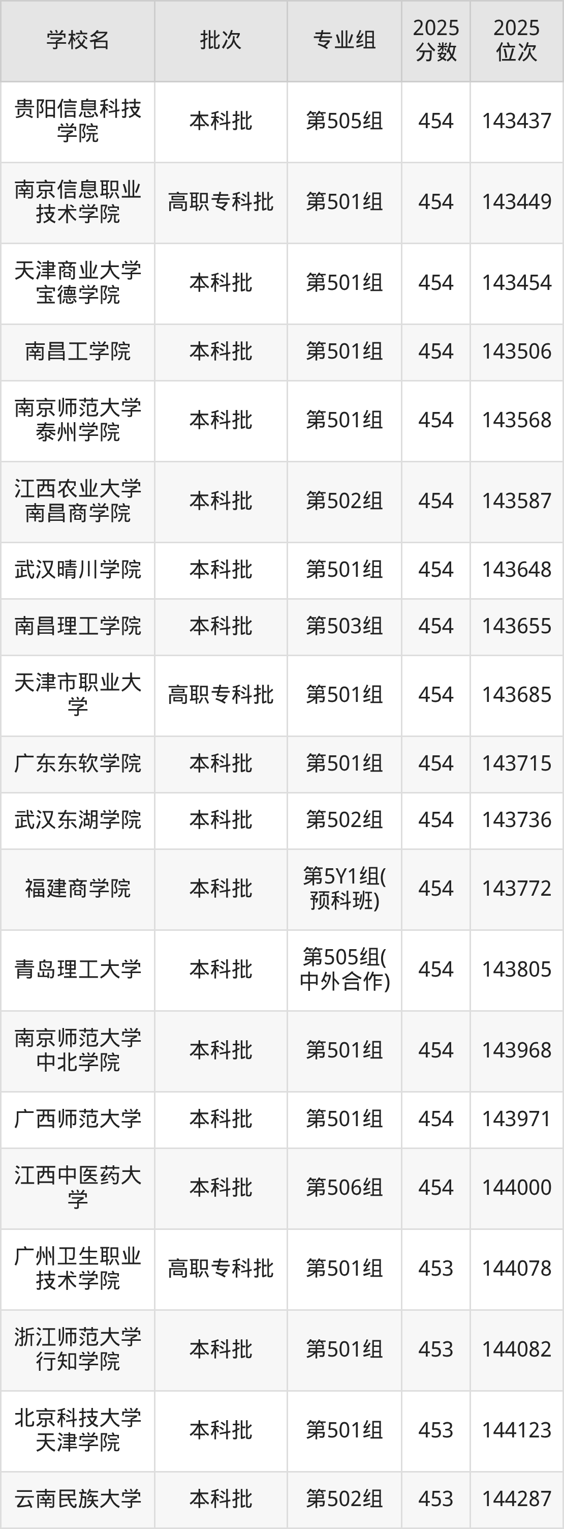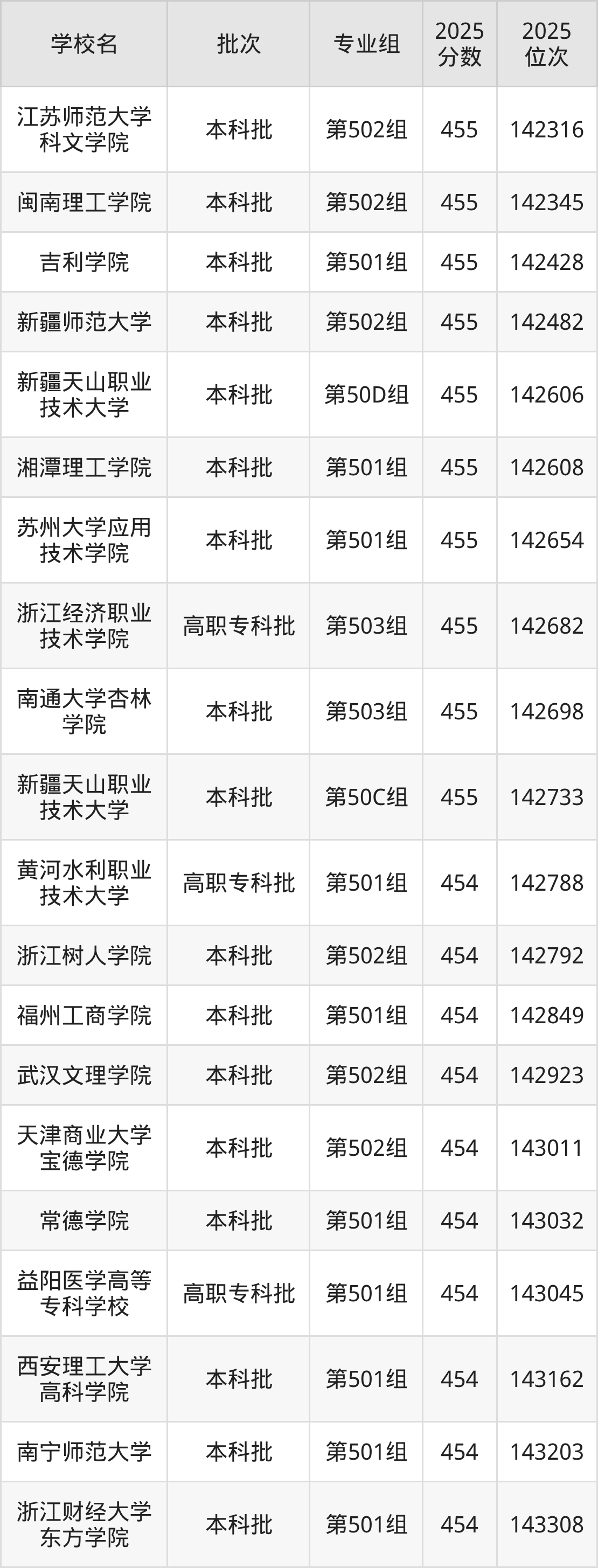 另外录取位次低于该区间(较稳妥)的有广州卫生职业技术学院第501组(144078名)、浙江师范大学行知学院第501组(144082名)等;录取位次高于该区间(可冲)的有新疆天山职业技术大学第50C组(142733名)、南通大学杏林学院第503组(142698名)等。